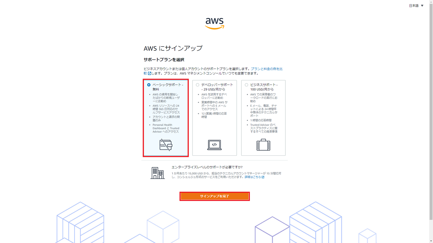今回は検証目的であり不要ですので、ベーシックサポートのままとします。