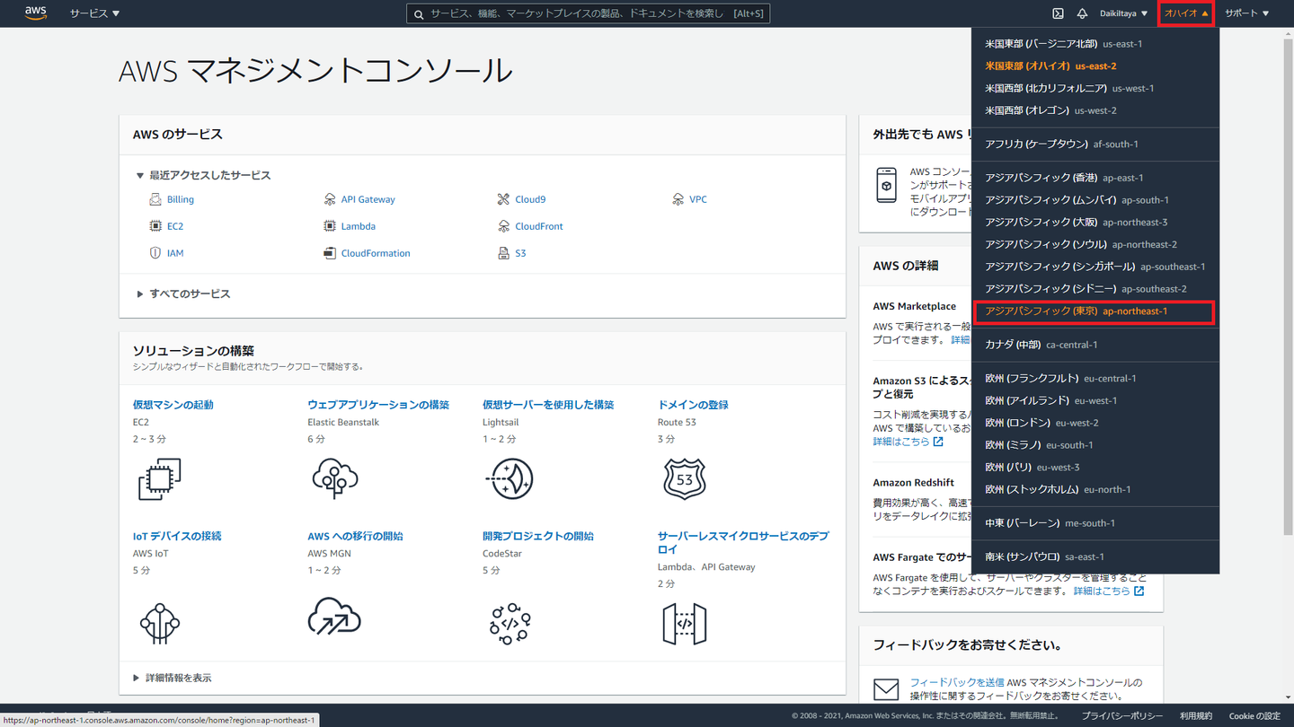 デフォルトで米国のオハイオリージョンを用いるように設定されているのですが、せっかく日本国内に住んでいるのなら日本のリージョンを使いたいところです。