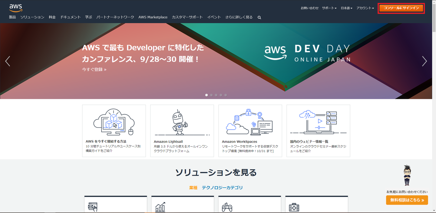 まず初めにインターネットでAWSと検索し、トップページを表示しましょう。