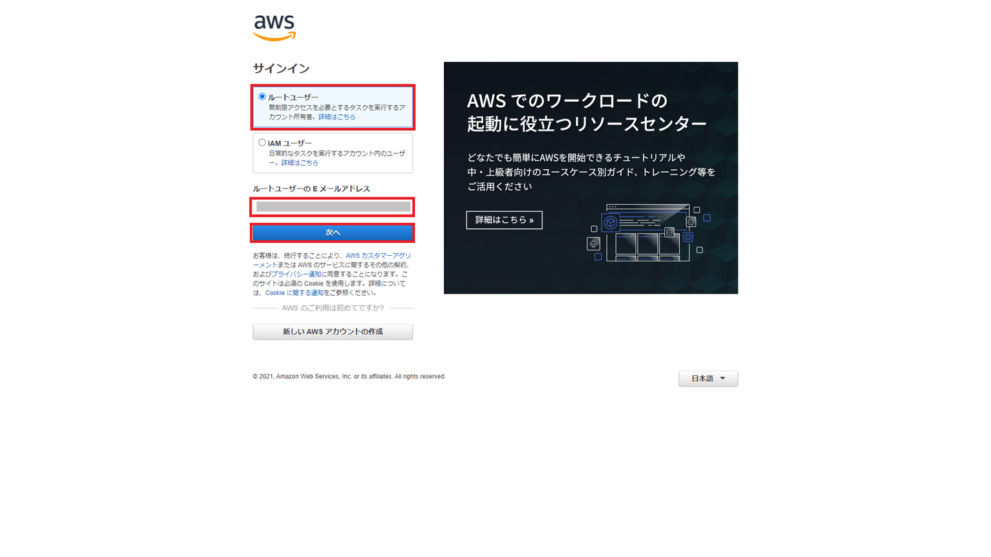 サインイン画面で「ルートユーザー」を選択したら、登録したEメールアドレスを入力して[次へ]をクリックします。