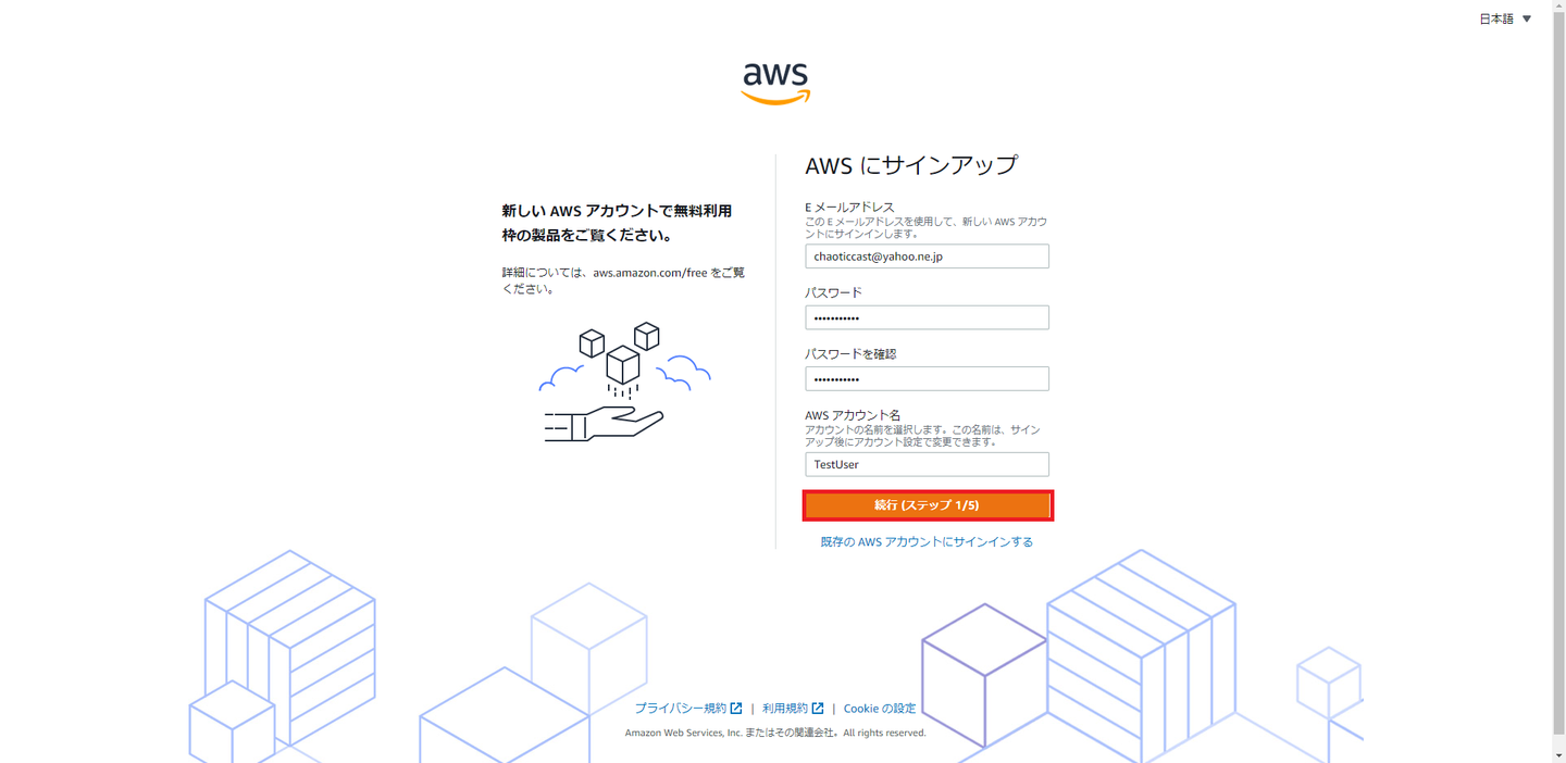 AWSにサインアップの画面が表示されたら、Eメールアドレスとパスワードを確認含め二回入力し、