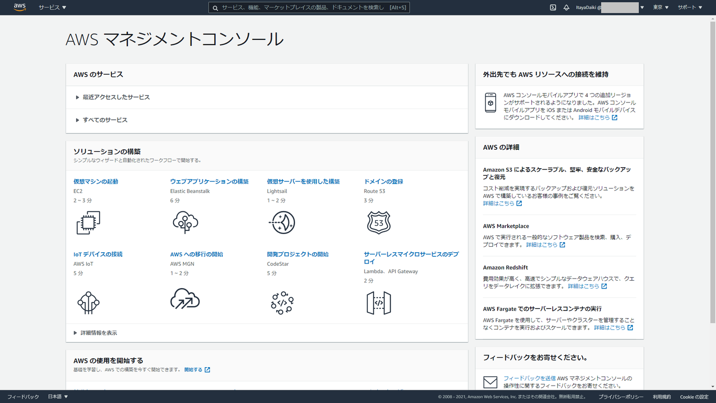 サインインして最初に表示されるこの画面は「AWSマネジメントコンソール」といい、AWSを利用する上で基本となるホーム画面となります。