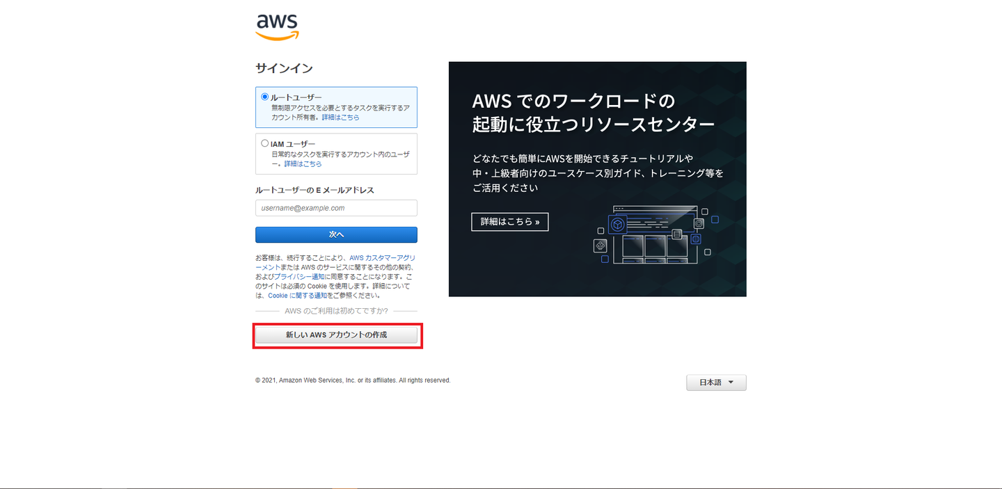 サインイン画面が表示されたら、[新しいAWSアカウントの作成]をクリック。