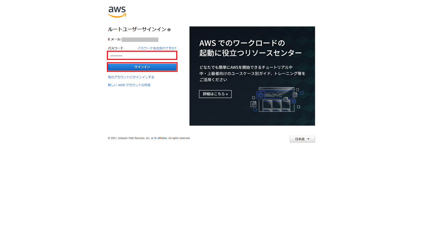 [AWSマネジメントコンソールへ進む]をクリックし、Rootユーザーでログインしてみましょう!