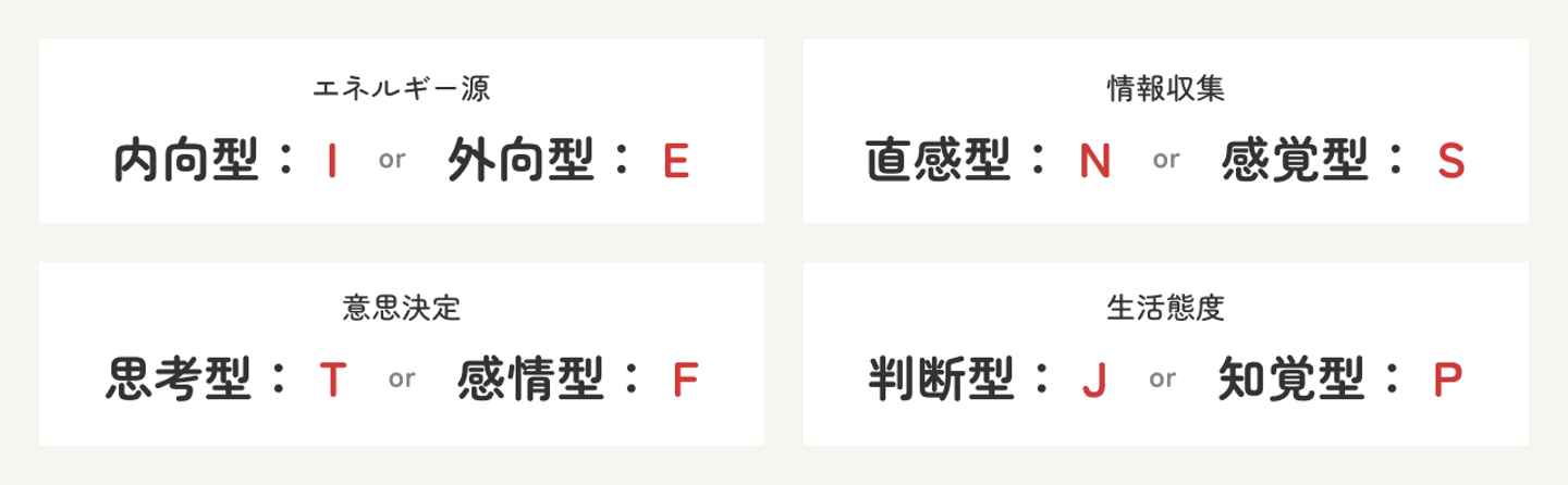 4つのカテゴリーを2択に分類し、その組み合わせから16種類の性格タイプが形成されるというもの。