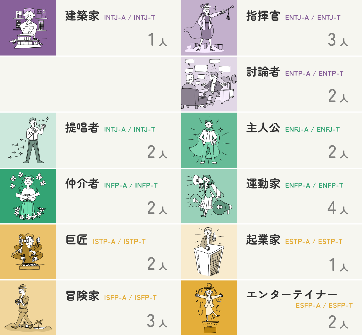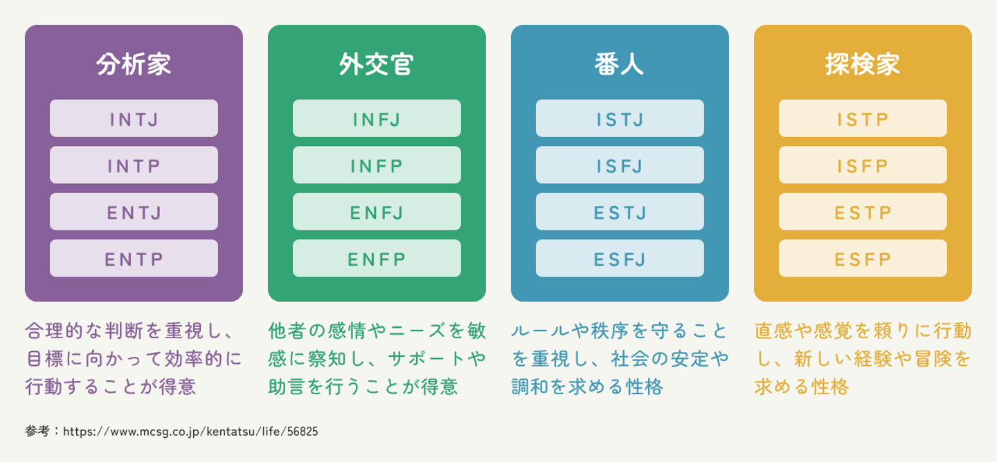 そんな仕事が向いているタイプは「分析家」「外交官」「探検家」が多いとされているんですよね。