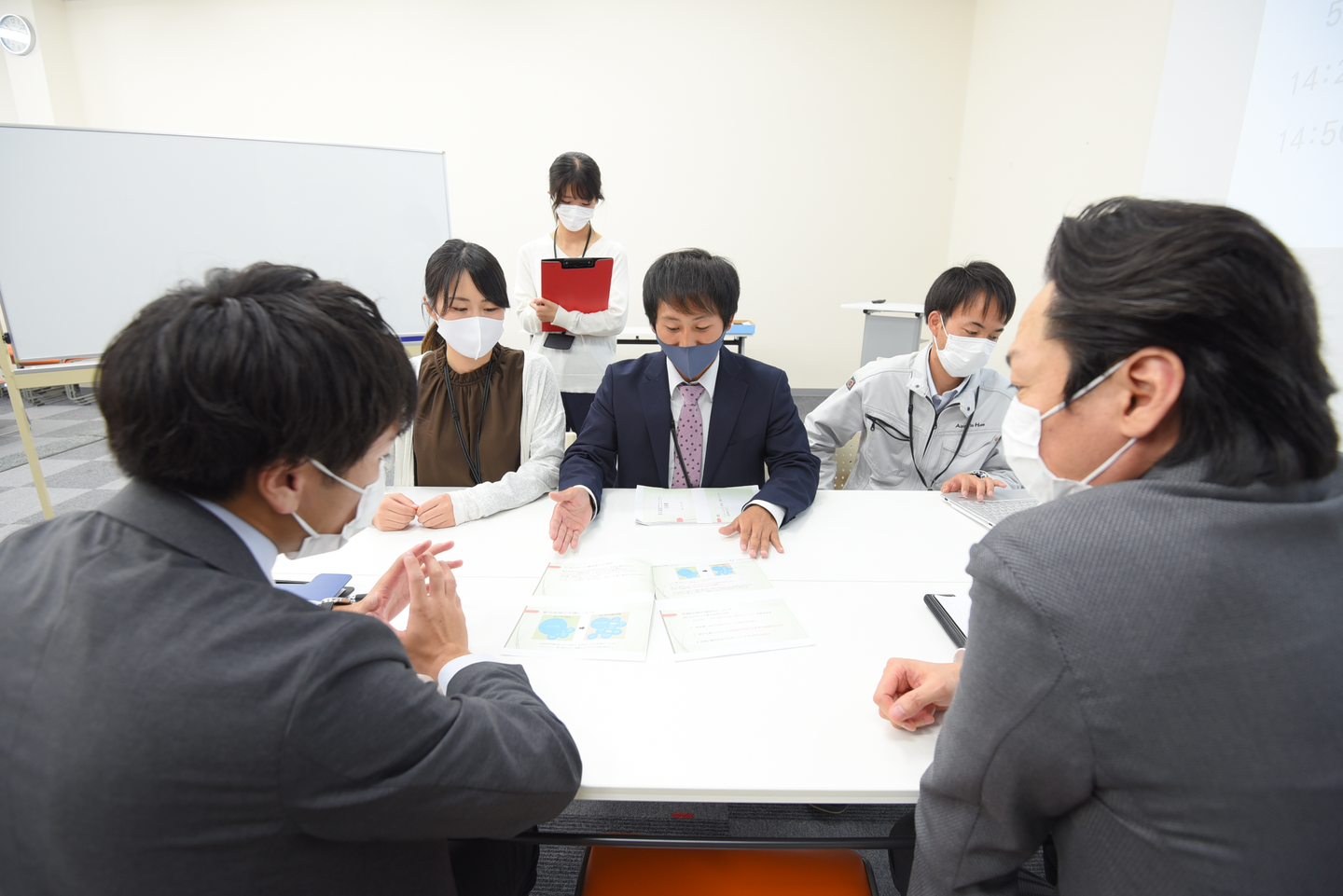 ここではそれを活かし、本当の商談の設定で机をはさんで先輩方へ新企画の提案!