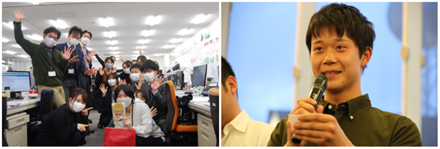 (左:部署内メンバーと飯井さん 右:懇親会に参加する飯井さん)