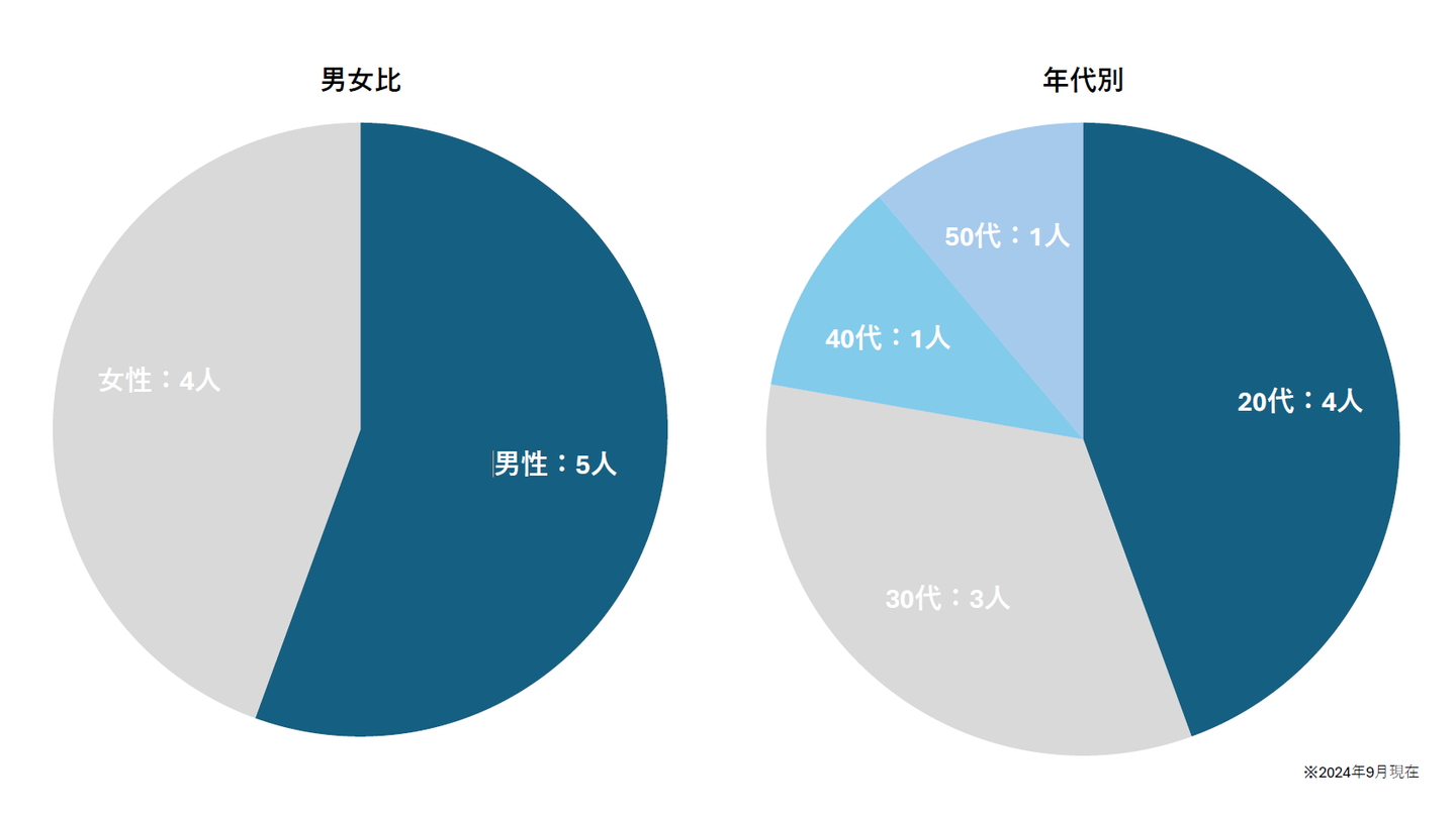 平均年齢は34.8歳、男性5名・女性4名の計9名という少数精鋭で運営しています!