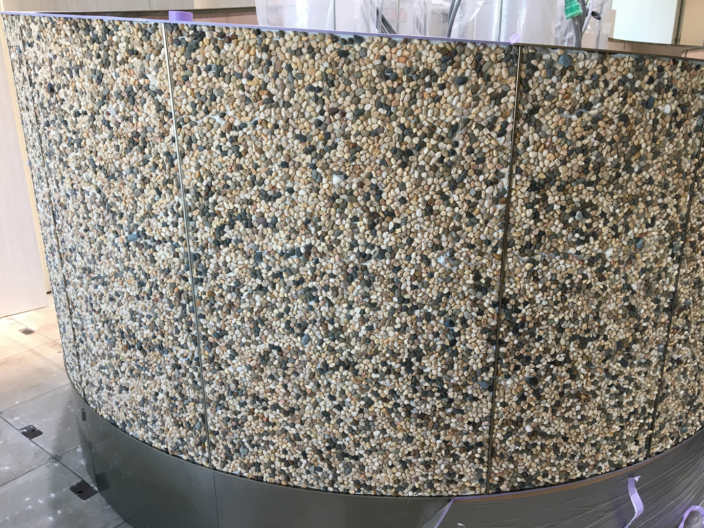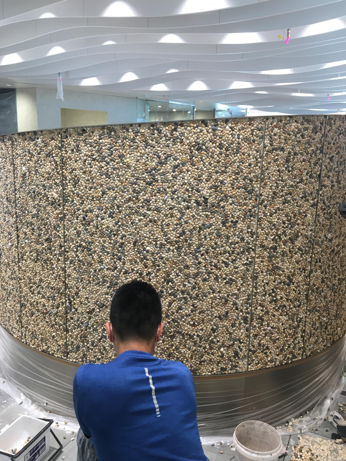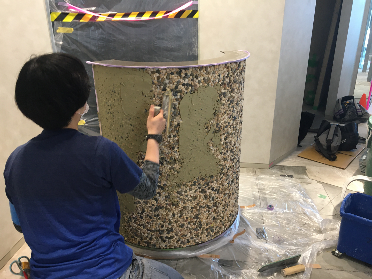 今回の現場は玉石のシートを曲面の壁面に張っていく仕事。