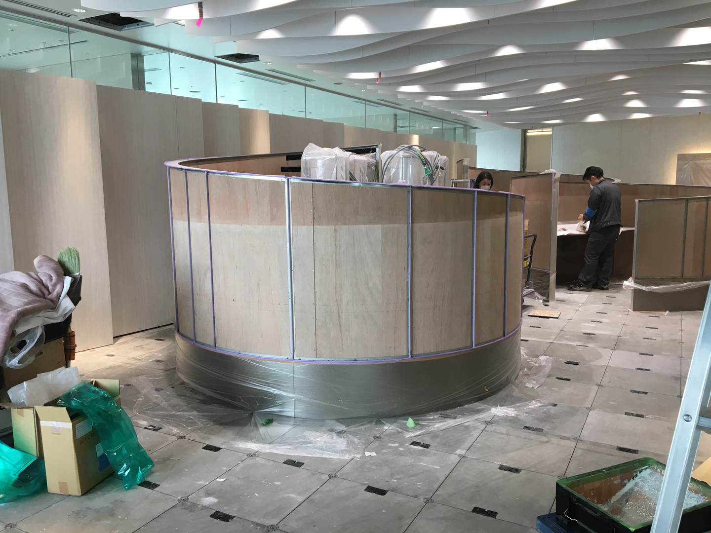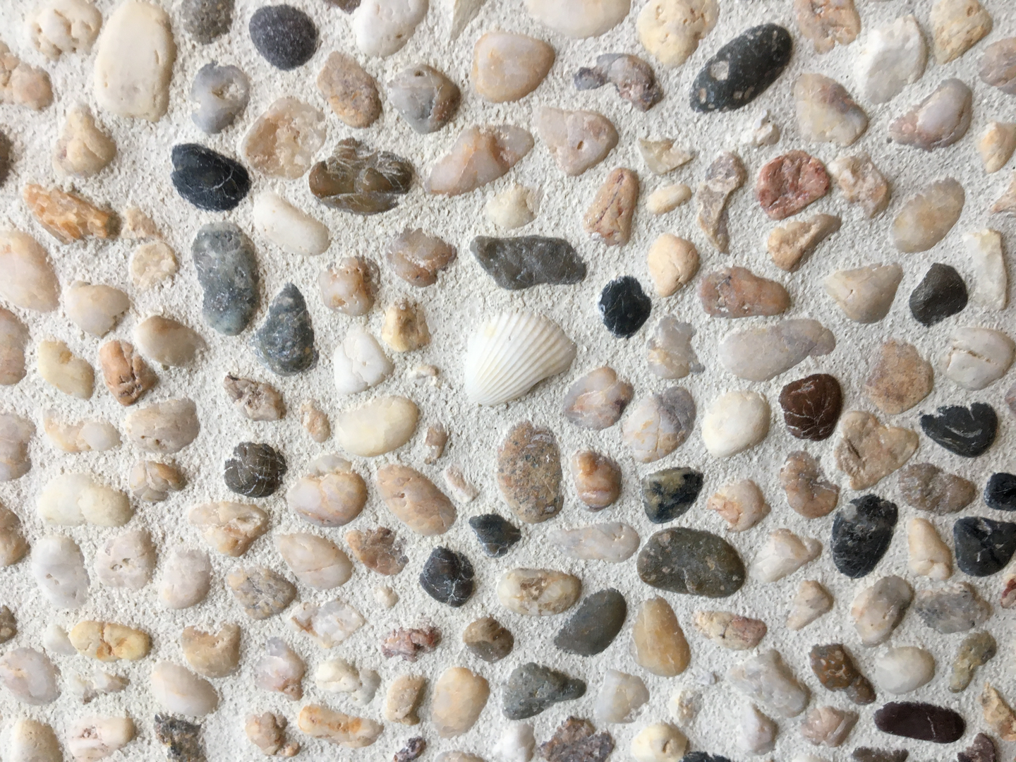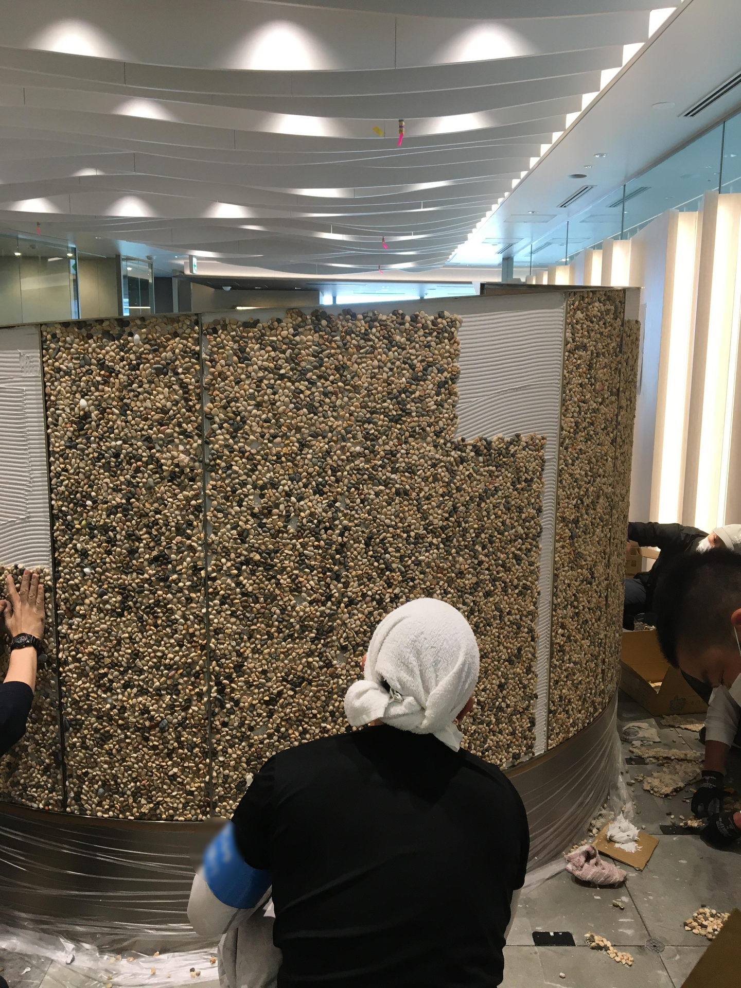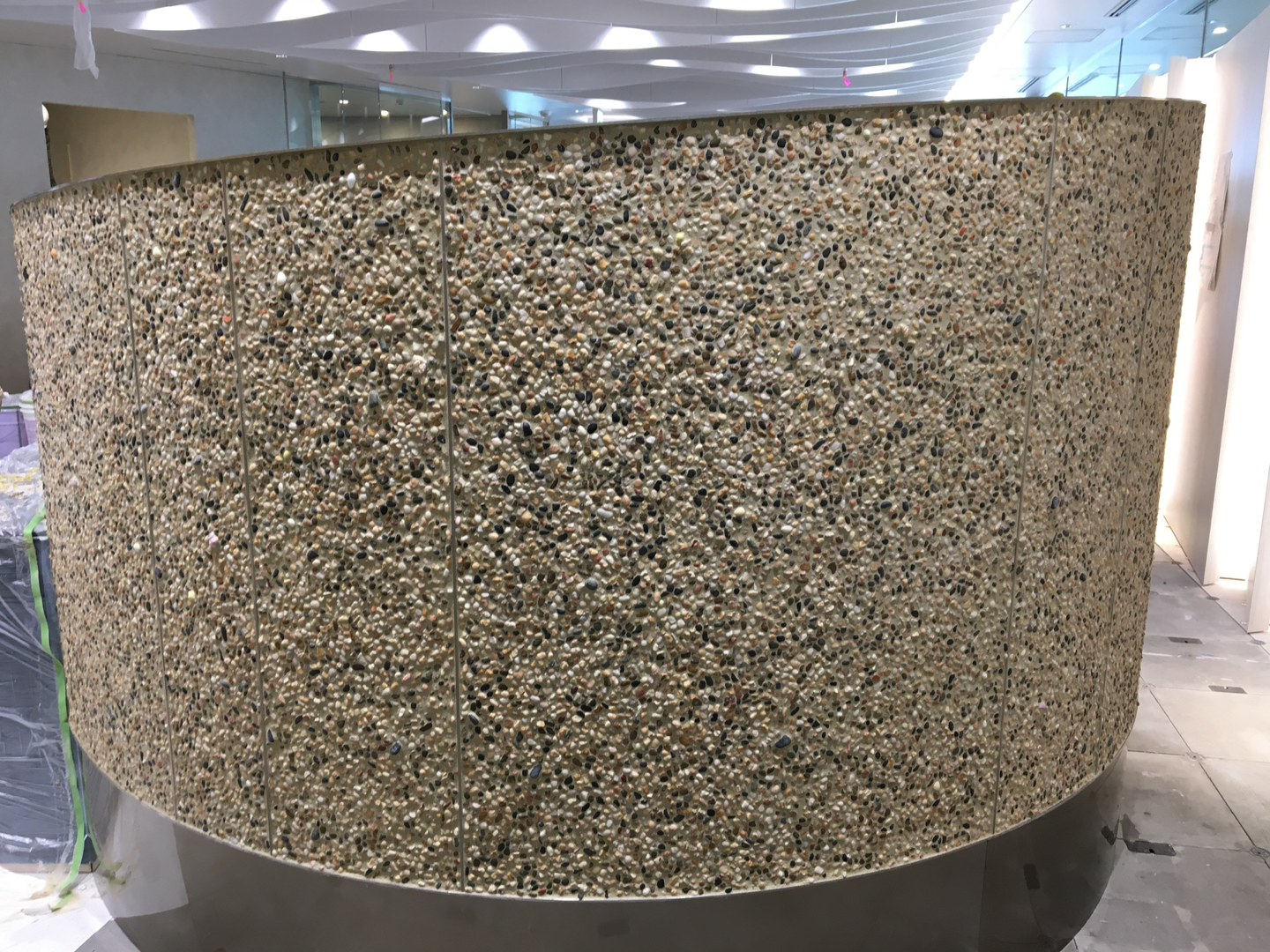 今回の現場は玉石のシートを曲面の壁面に張っていく仕事。