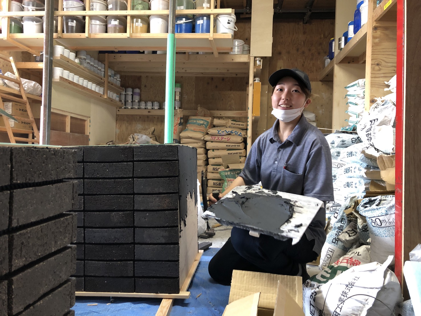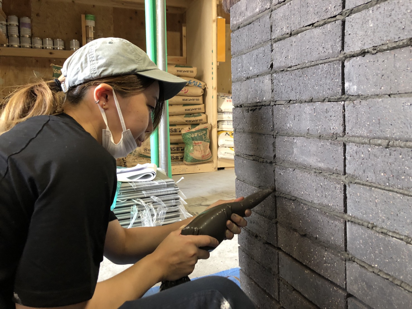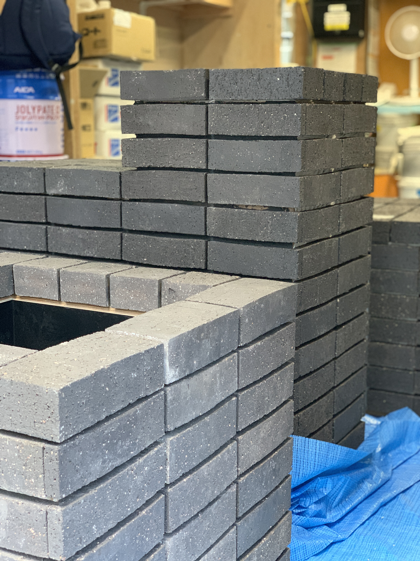 今回は木工什器にレンガタイルを張って仕上げる仕事。