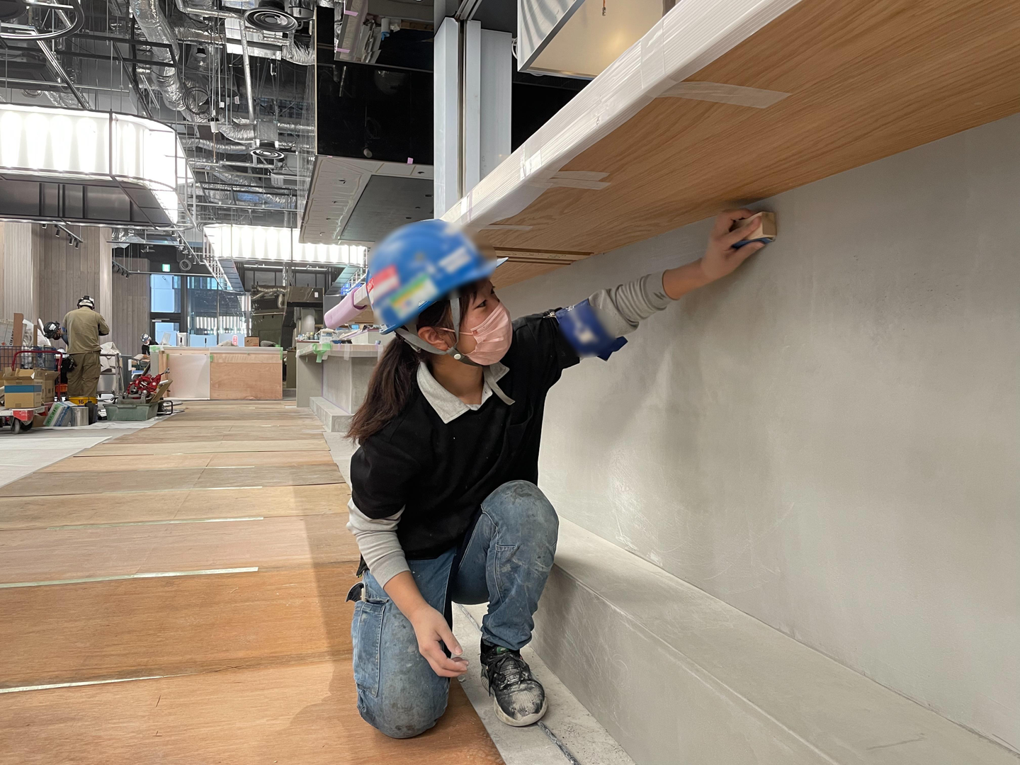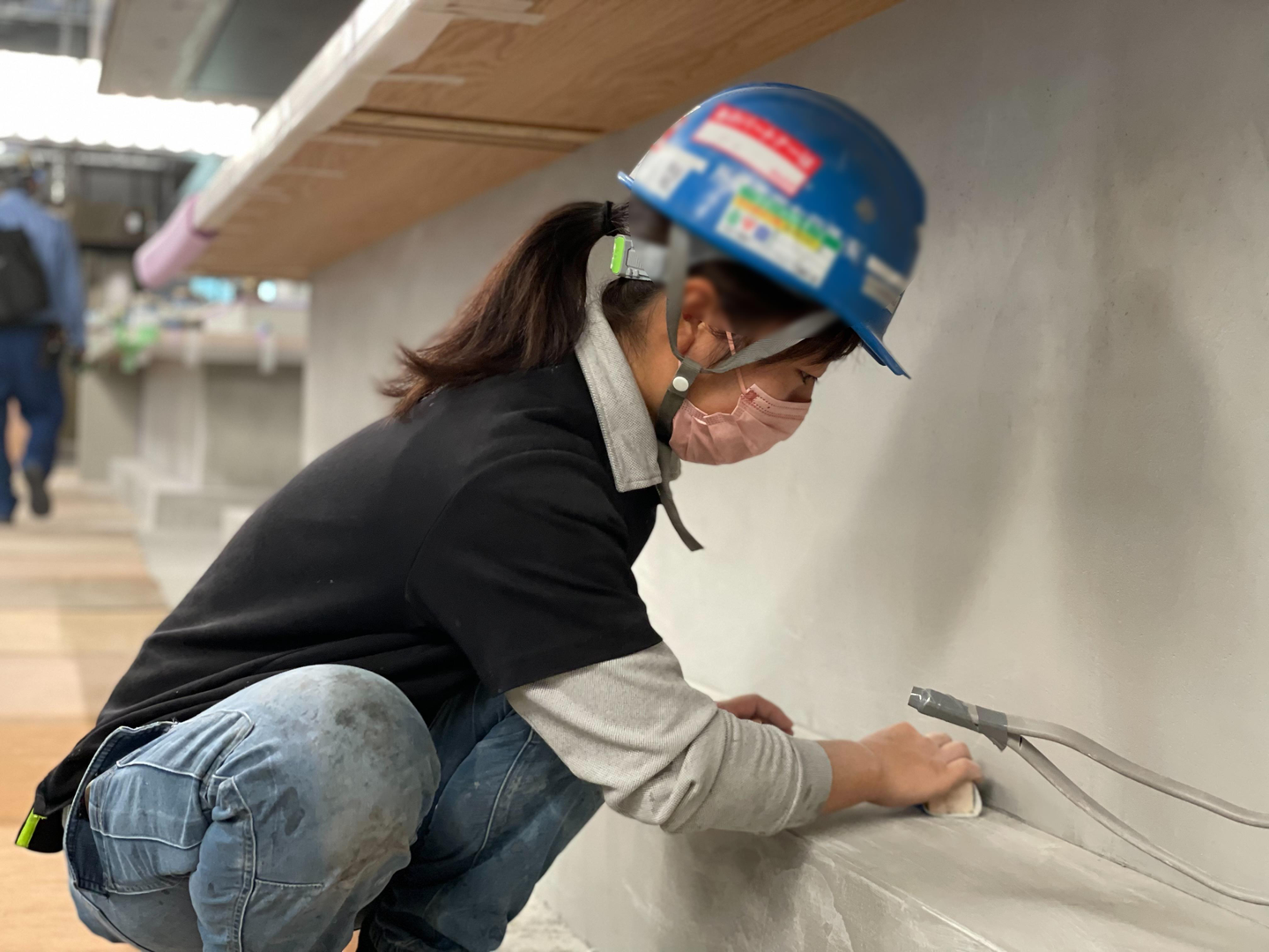 写真で見る限りでは地味ですが、左官は水もの仕事なので、塗り始めたら止まれません。