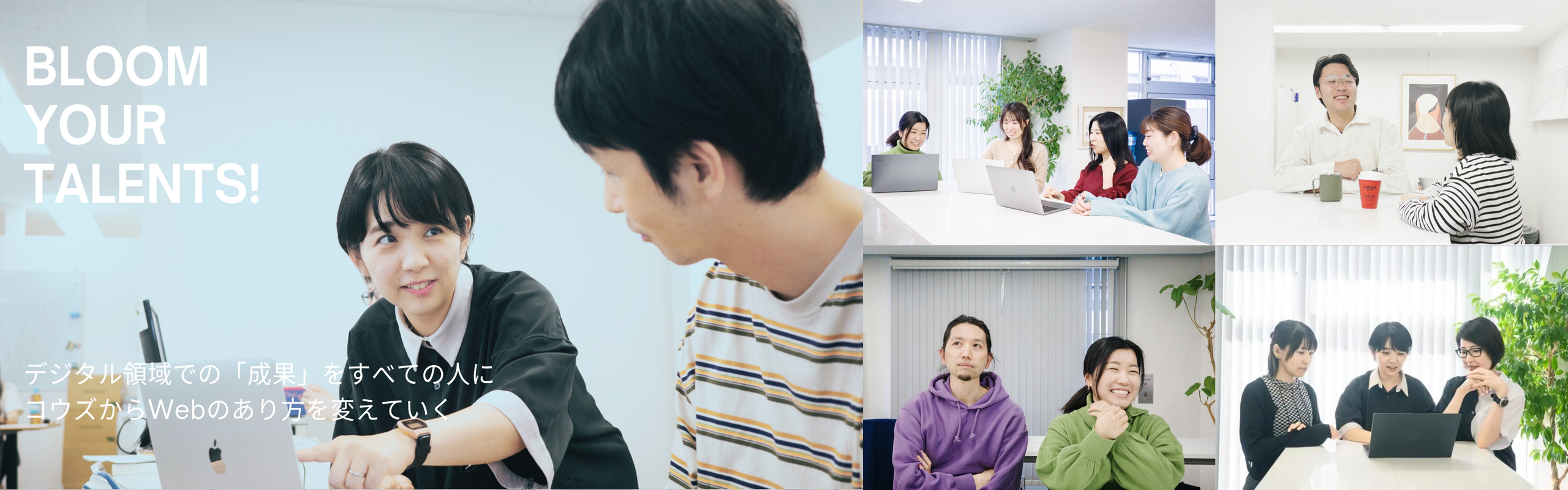 社内の雰囲気は非常に良く、先輩・後輩に関わらず疑問や質問があったらすぐに質問できる環境です。営業、ディレクター、デザイナー、エンジニアなど職種を超えて常に声を掛け合っています。穏やかで落ち着いた社員が多く、新入社員は「優しい人が多いですね」と口を揃えています。