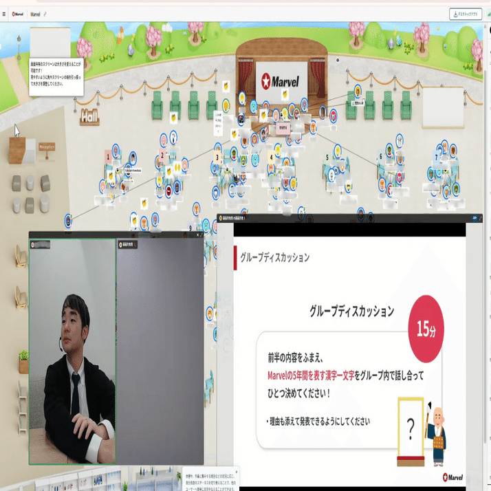 衝撃の発表から休憩を挟み、後半はグループディスカッションが行われました。 1チーム約10名、計19チームに分かれ、普段は異なる現場で活躍する社員同士が交流しました。テーマは「Marvelの5年間を表す漢字一文字」。