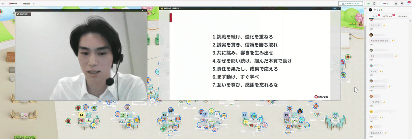 創業以来の軌跡を共有するとともに、後半には組織の未来を左右する「重大発表」も行われました!それは、新たな行動原理「Principle」の策定、そして「Marvel株式会社」から「FLARETECH株式会社」への社名変更です。