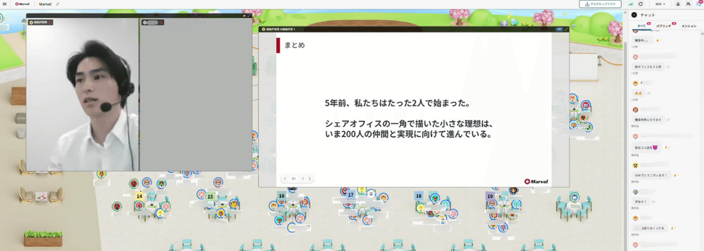 2020年10月14日、千葉ニュータウンからの帰りに立ち寄った「いきなりステーキ」で創業を決意したエピソードから始まり、シェアオフィスの一角から2名でスタートした会社が、いかにして現在の200名を超える組織へと成長したかが振り返られました。