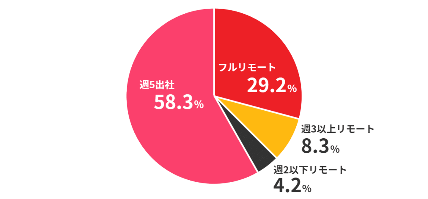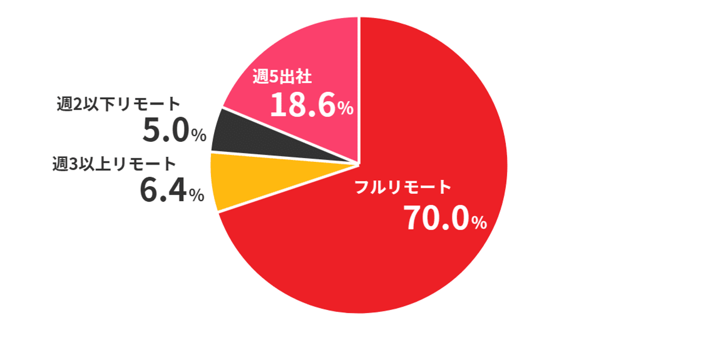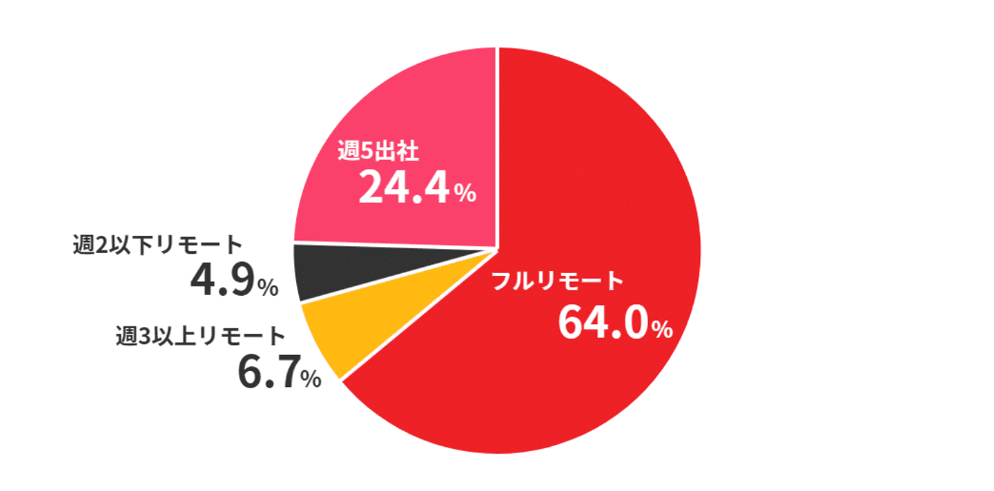 全社員: フルリモート 64.0% / 週5日出社 24.4% 経験3年以上: フルリモート 70.0% / 週5日出社 18.6% 経験3年未満: フルリモート 29.2% / 週5日出社 58.3% 経験3年以上のエンジニアの7割がフルリモートを実現している一方で、3年未満のメンバーは約6割が「完全出社」という結果になりました。