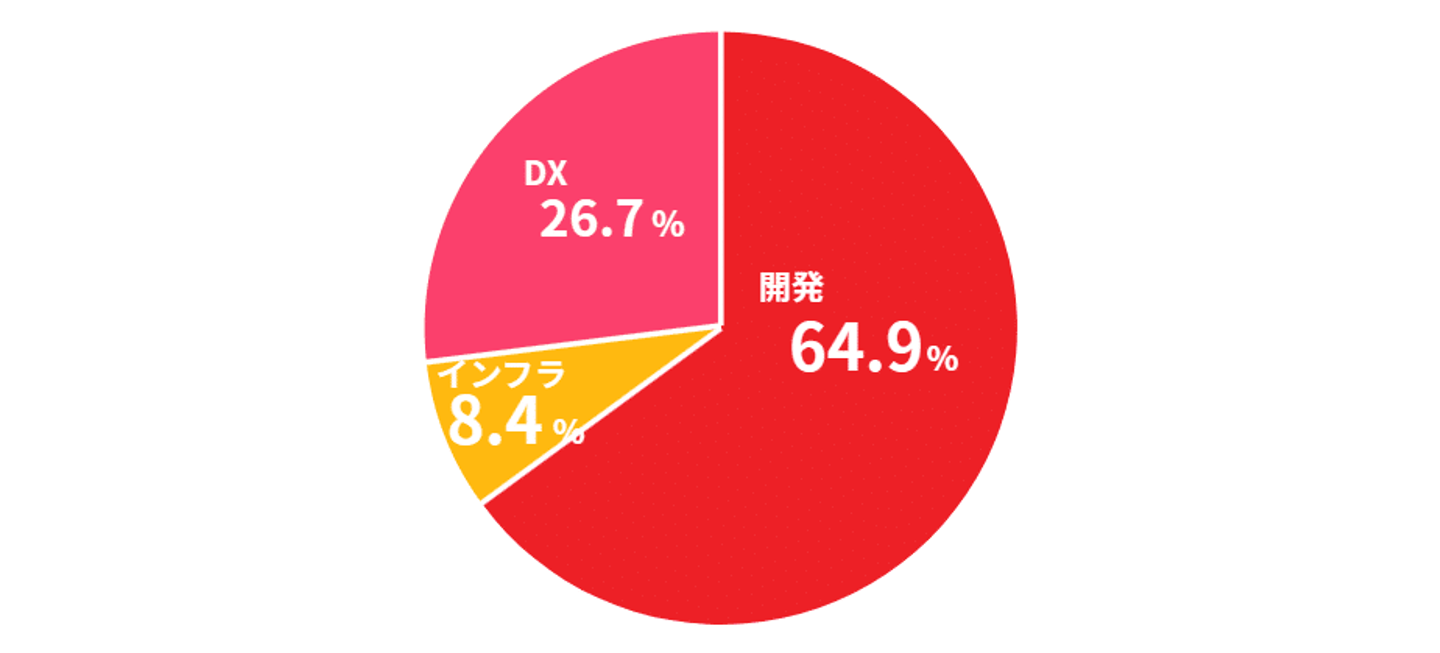エンジニアの技術分野別の割合は、開発が64.9%、DXが26.7%、インフラが8.4%となっています。 FLARETECHに入社後、Reactを使ったフロントエンド開発から、AWS中心のクラウドインフラ構築へ、未踏のキャリアチェンジを実現したエンジニアもいます。