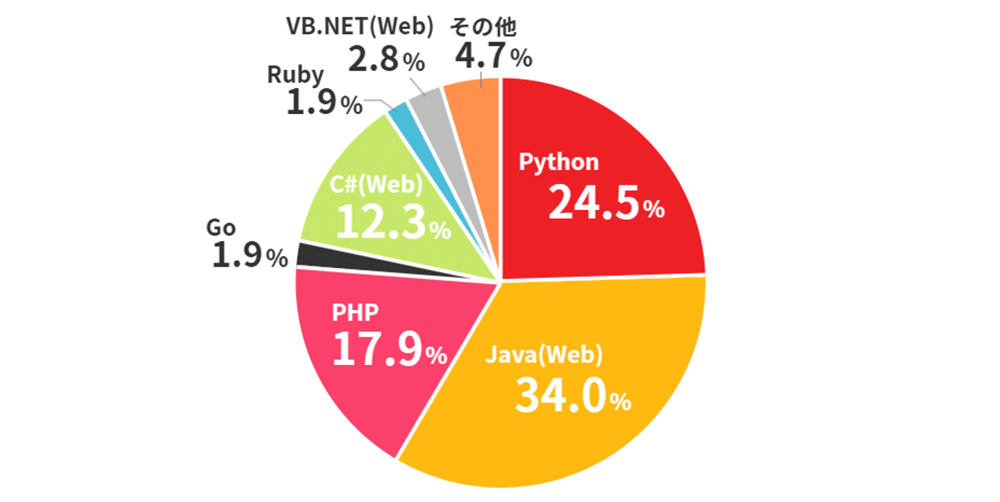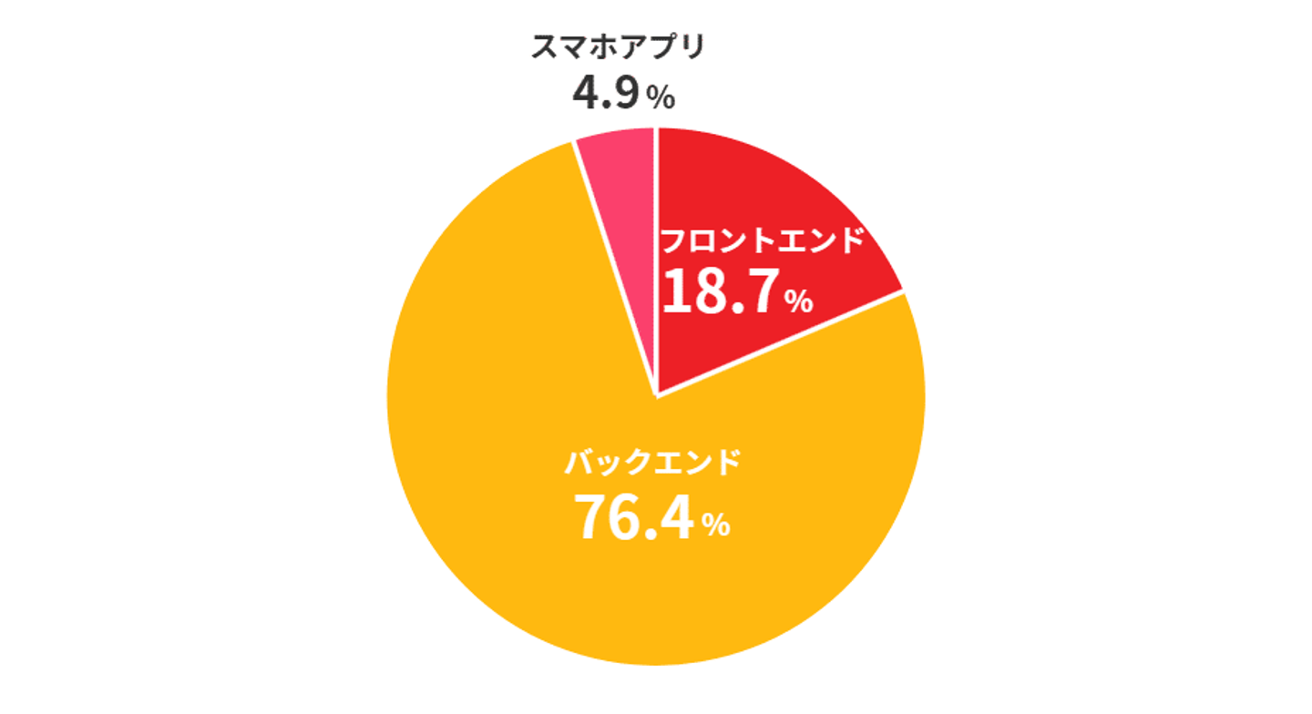 FLARETECHのエンジニア構成は、バックエンド領域が全体の76.4%と高い比率を占めています。主要言語はJava(34.0%)、Python(24.5%)、PHP(17.9%)、C#(12.3%)といったWeb系言語がメインです。