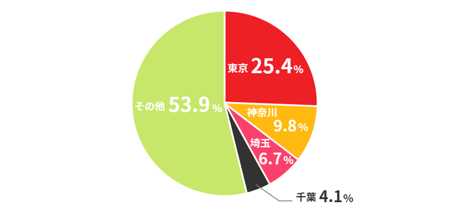 2025年9月現在、社員の居住地は、東京都が25.4%、神奈川県が9.8%、埼玉県が6.7%、千葉県が4.1%、その他のエリアが53.9%となっています。 また、FLARETECH社員の特徴の一つとして、北は北海道、南は沖縄までの社員が在籍していますが、中でも大阪、北海道在住の社員が多く在籍しています。(大阪 5.7%、北海道 6.7%)