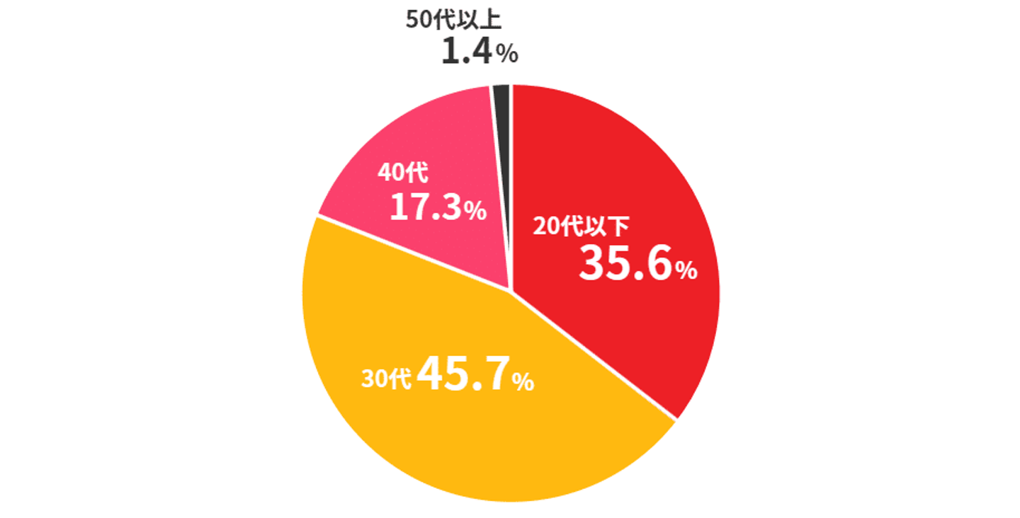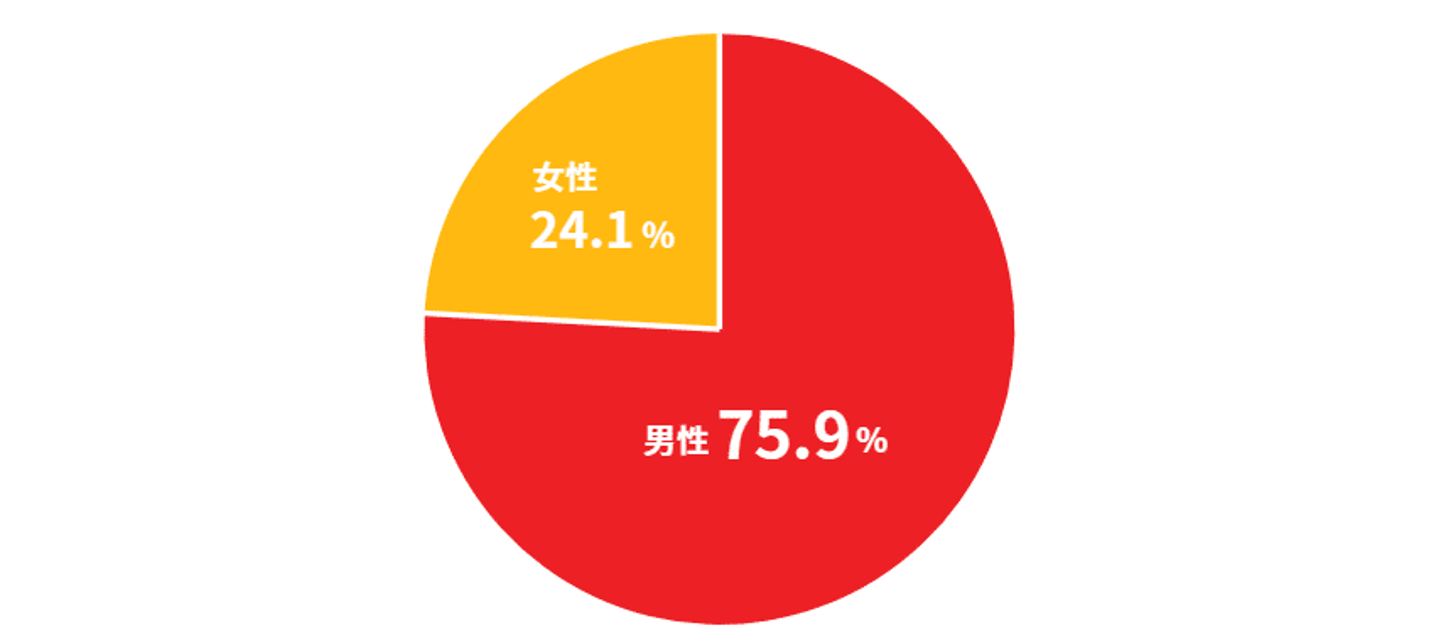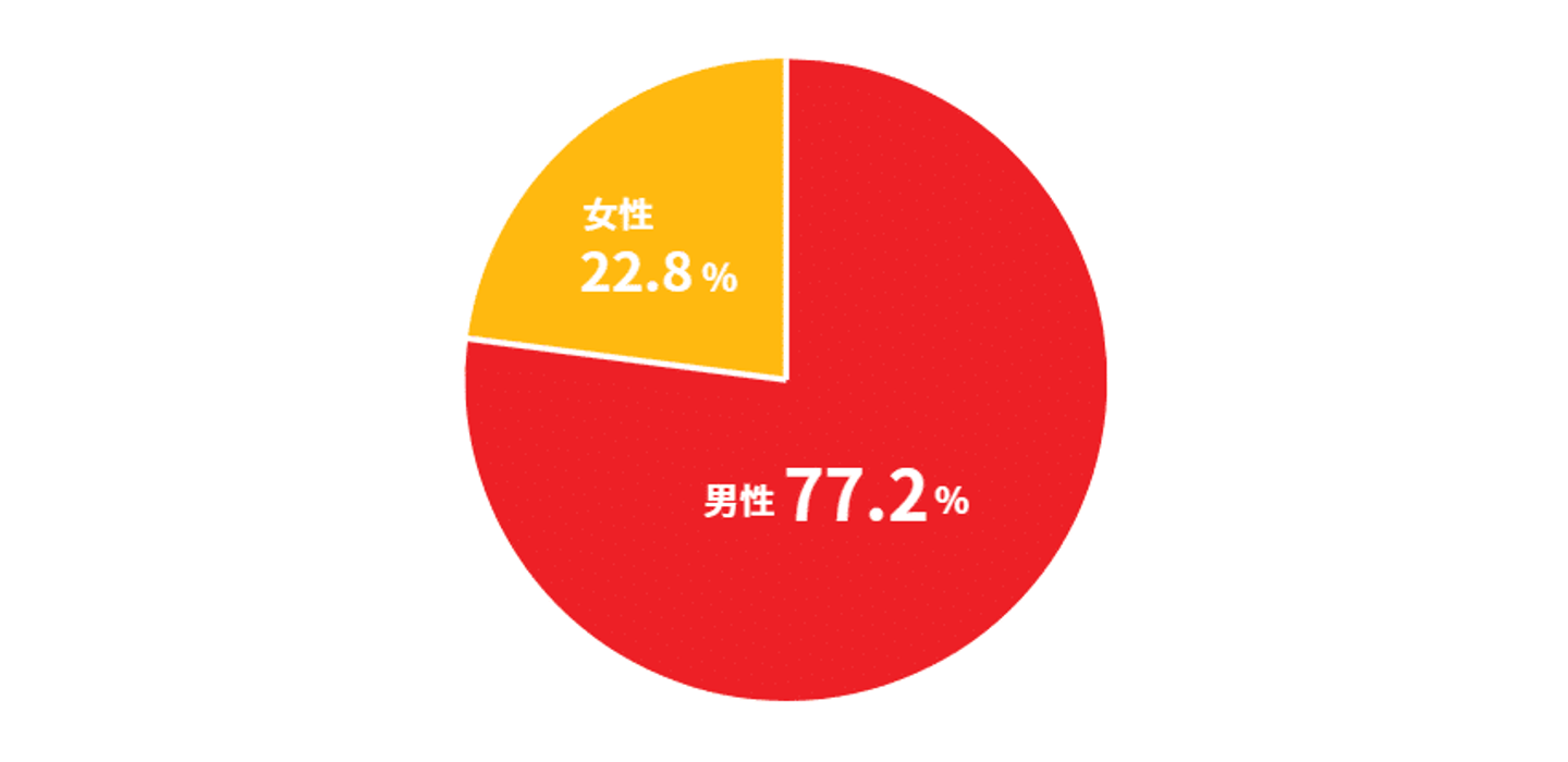 全体: 男性 75.9% / 女性 24.1% エンジニア: 男性 77.2% / 女性 22.8% 管理部: 男性 66.7% / 女性 33.3% IT業界全体における女性比率は約2割前後と言われており、当社の構成も業界の標準的なボリュームゾーンと重なっています。