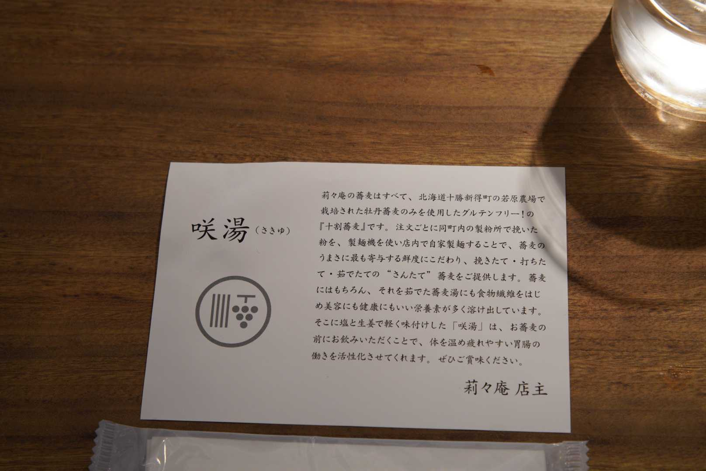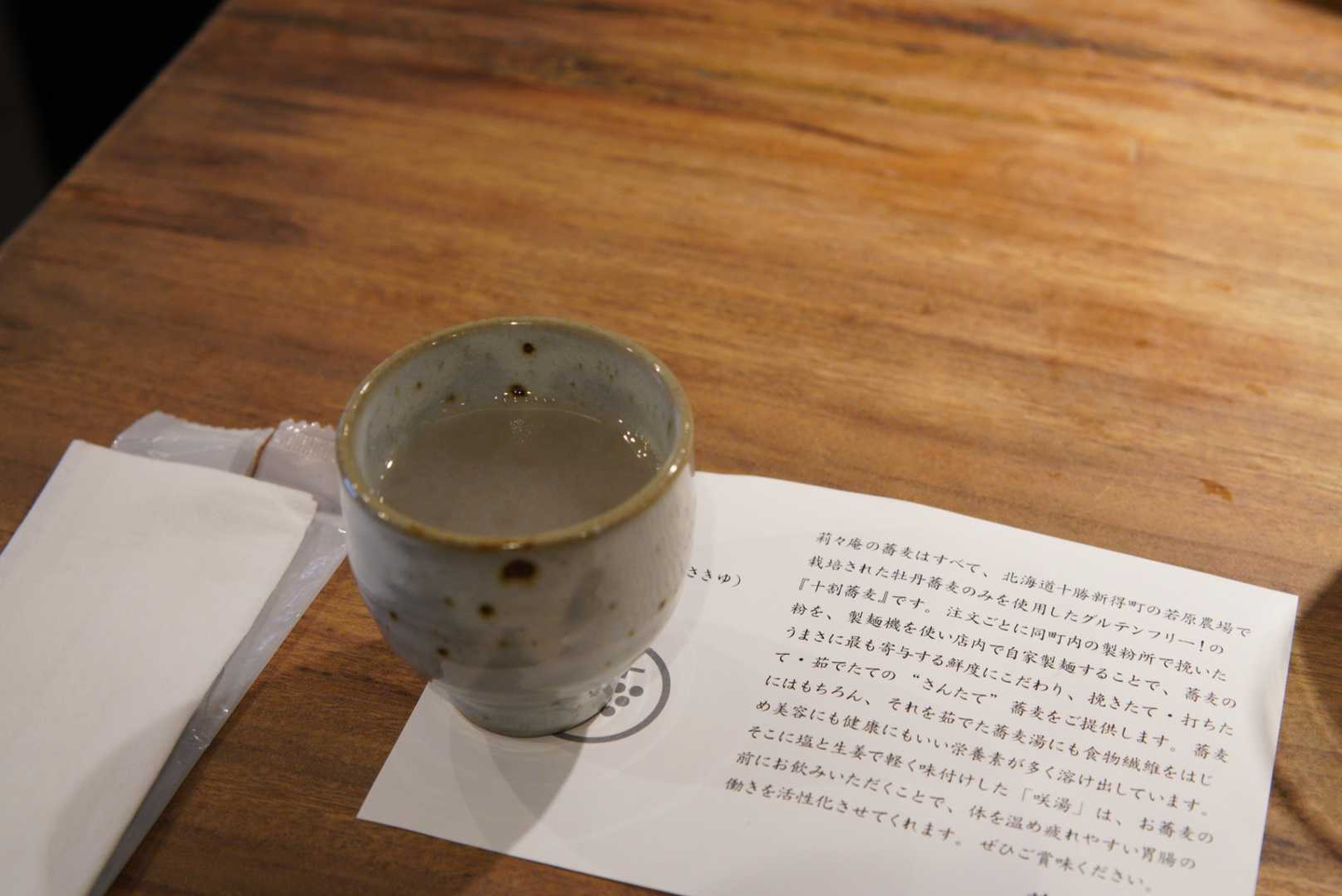これが咲湯というもの。蕎麦湯に生姜と塩が入ったものでした。