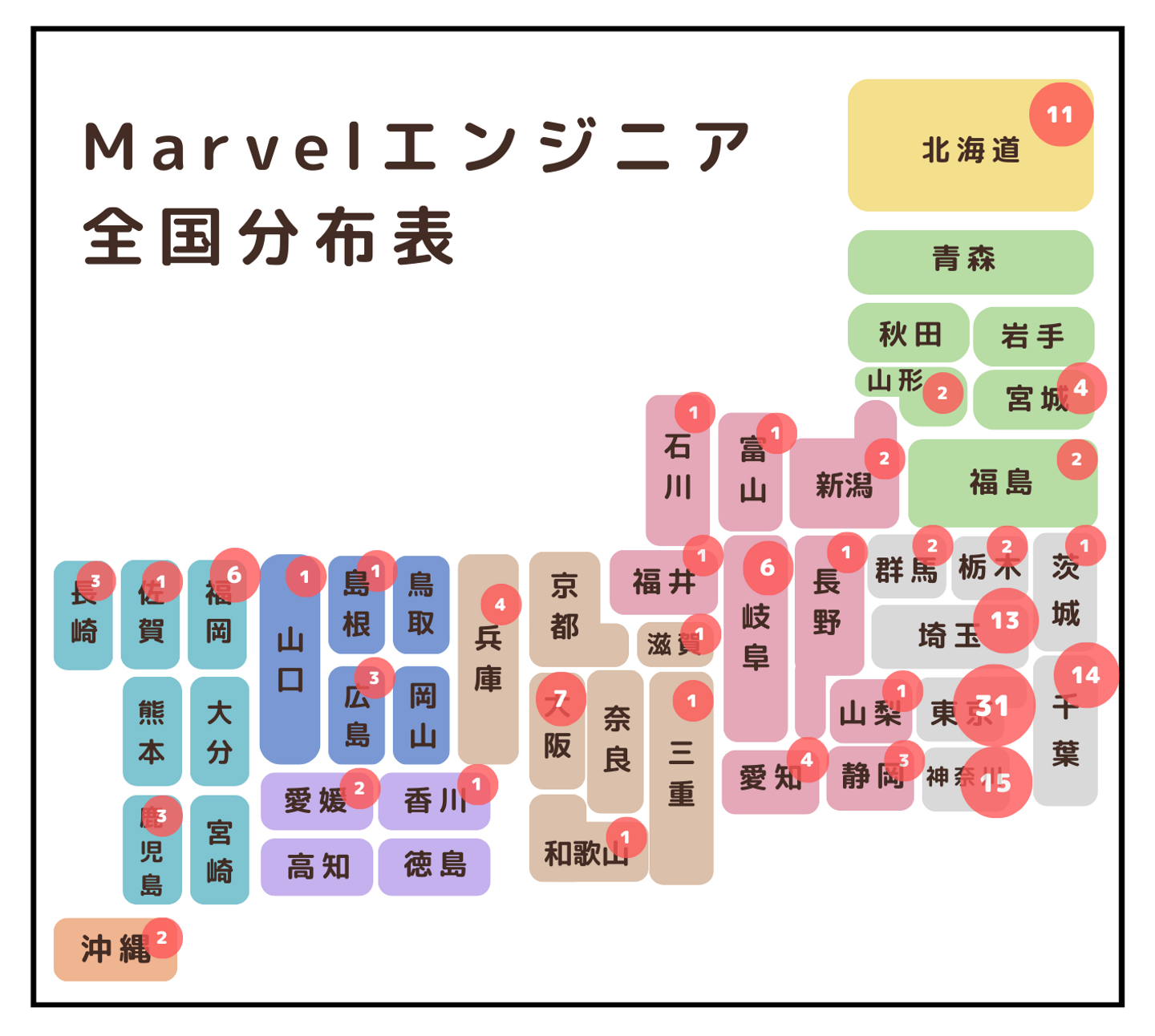 47都道府県のうち、37都道府県にMarvelのエンジニアがいらっしゃいます😎