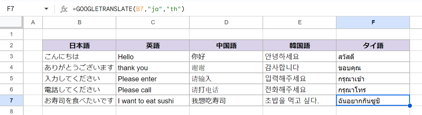 スプレッドシート独自の関数で、Google翻訳を用いて自動的に翻訳をしてくれる関数です。