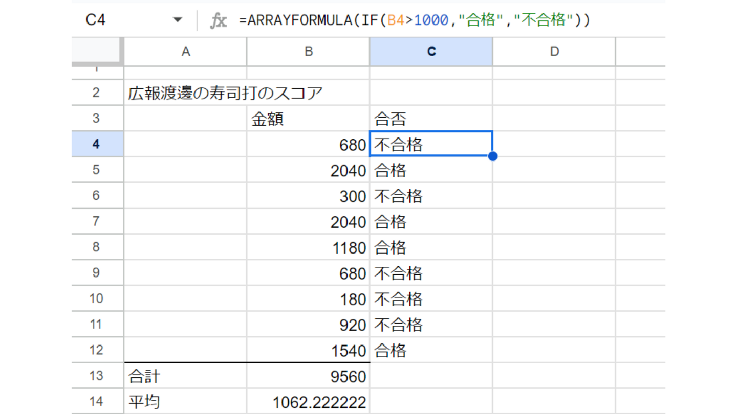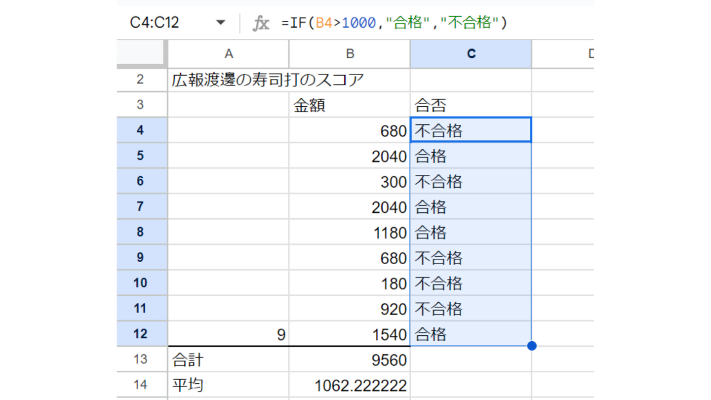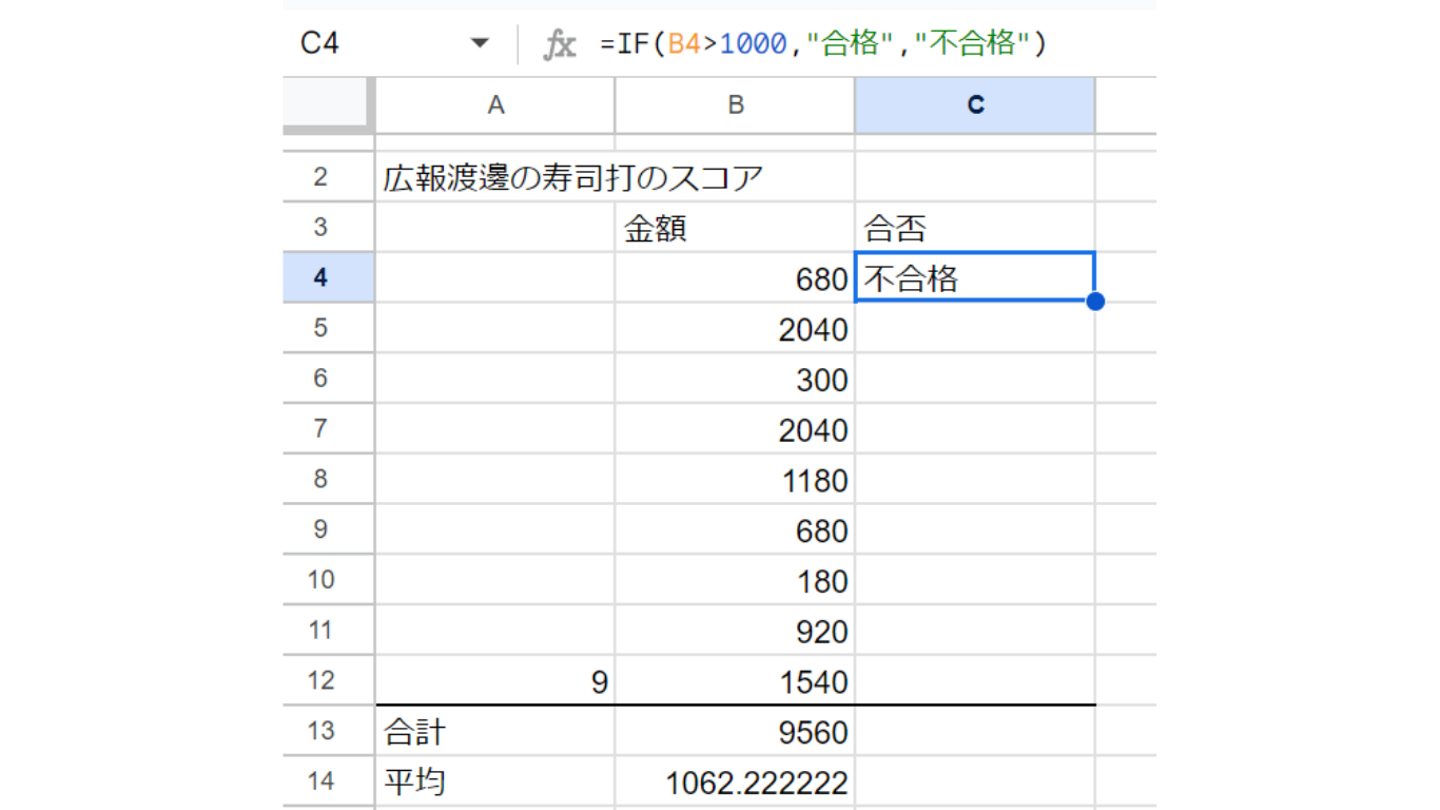 今回は寿司打1000円以上が合格、1000円未満が不合格という条件でIF関数を活用してみました👀