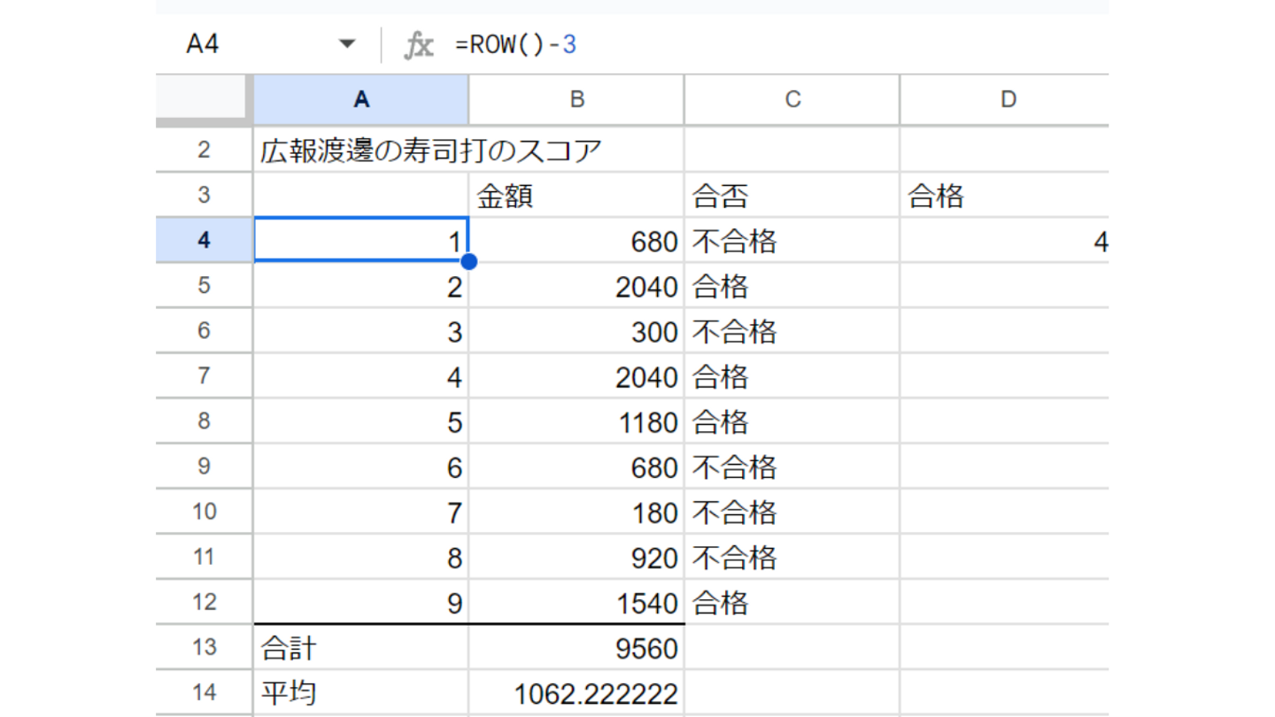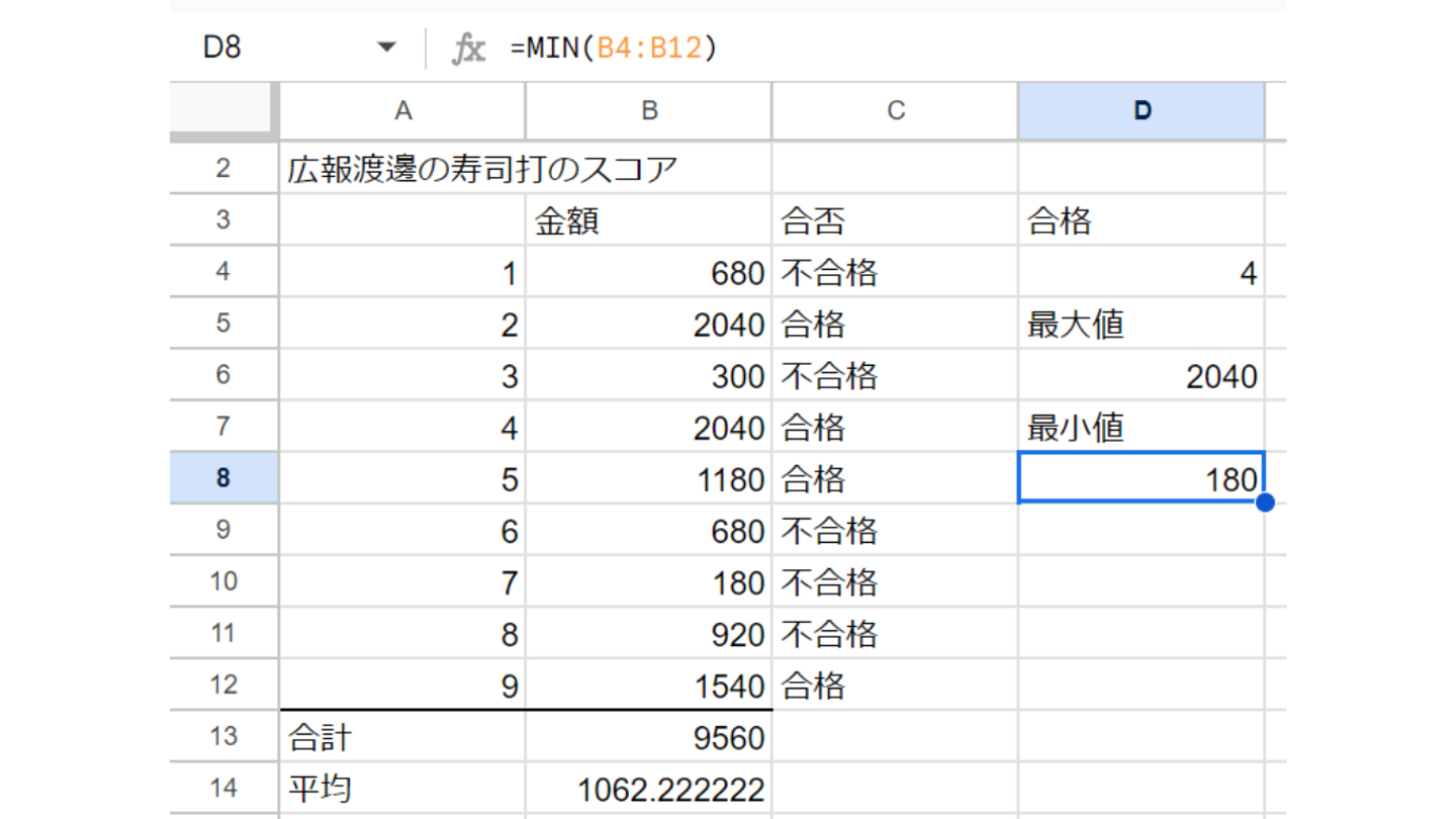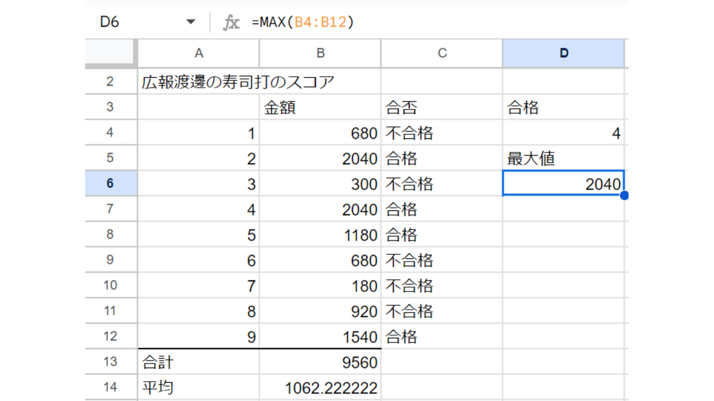 今回は寿司打1000円以上が合格、1000円未満が不合格という条件でIF関数を活用してみました👀