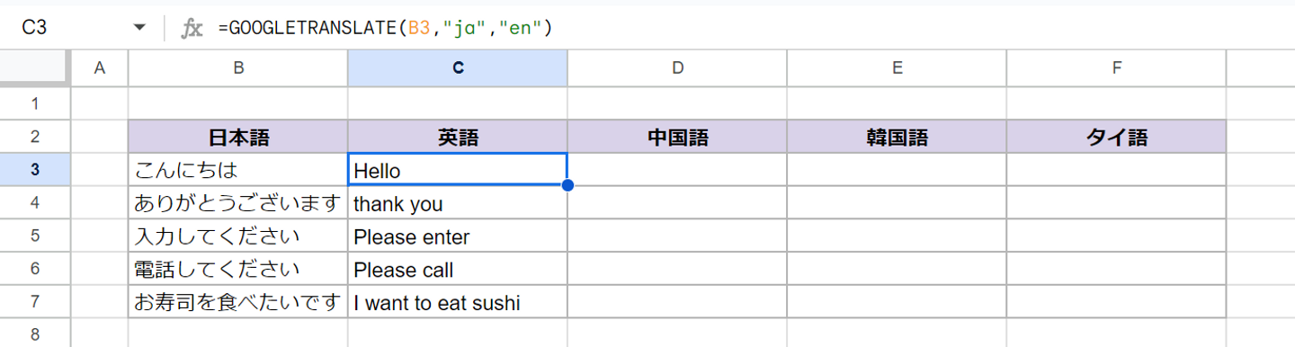 =GOOGLETRANSLATE(B4, "ja", "en")」