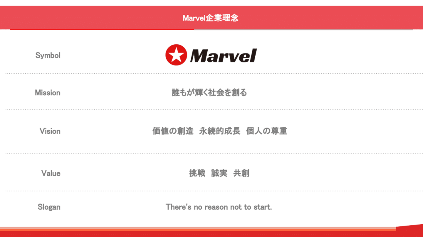 Marvelには以下のような企業理念(ミッション・ビジョン・バリュー・スローガン)が存在します。