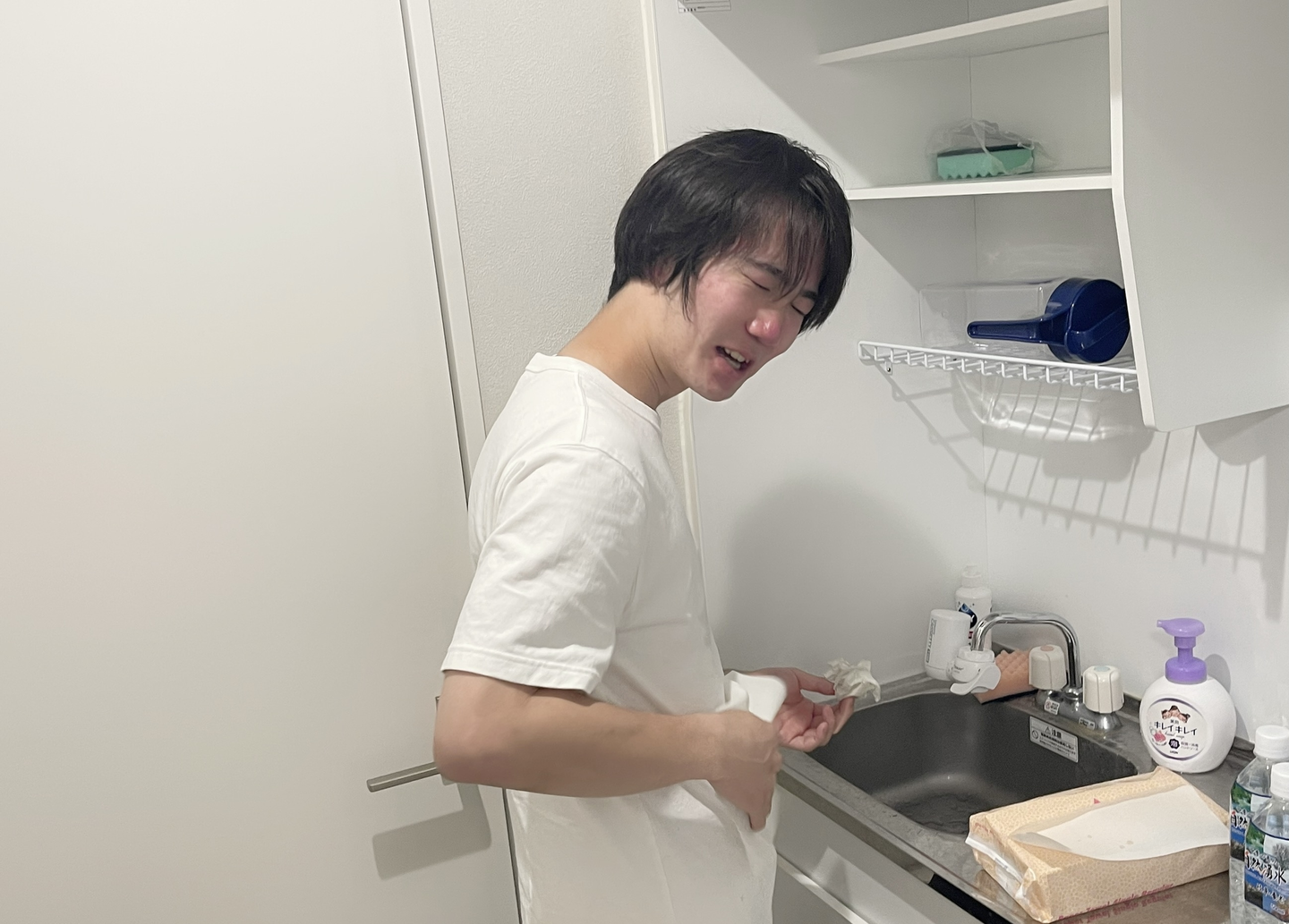 抱えながら....、帰ってきた瞬間、お酢入りの水をゴクリ。一口飲んだ瞬間…...