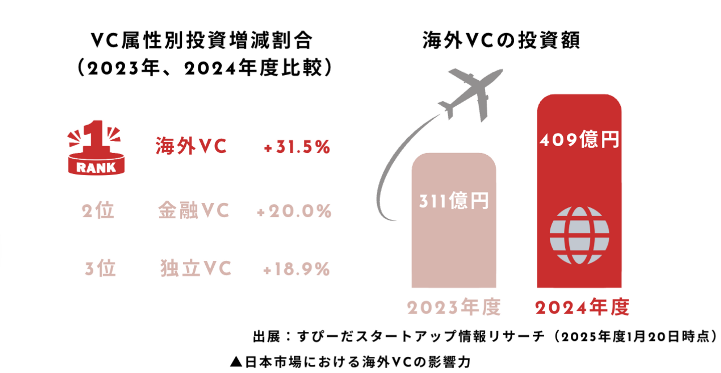 日本のスタートアップへのVC投資において、外資系VCによる投資額は増加傾向にありました。VC属性別に増加した割合では、外資系VCがトップ(不明、未分類は除く)。投資額も約90億円増加。10億円以上の大型調達案件においては海外VCの存在感が数字以上に増しているとも指摘されています。日本のスタートアップがグローバルな資金を惹きつける上で、英語でのコミュニケーション能力が不可欠であると考えられます。