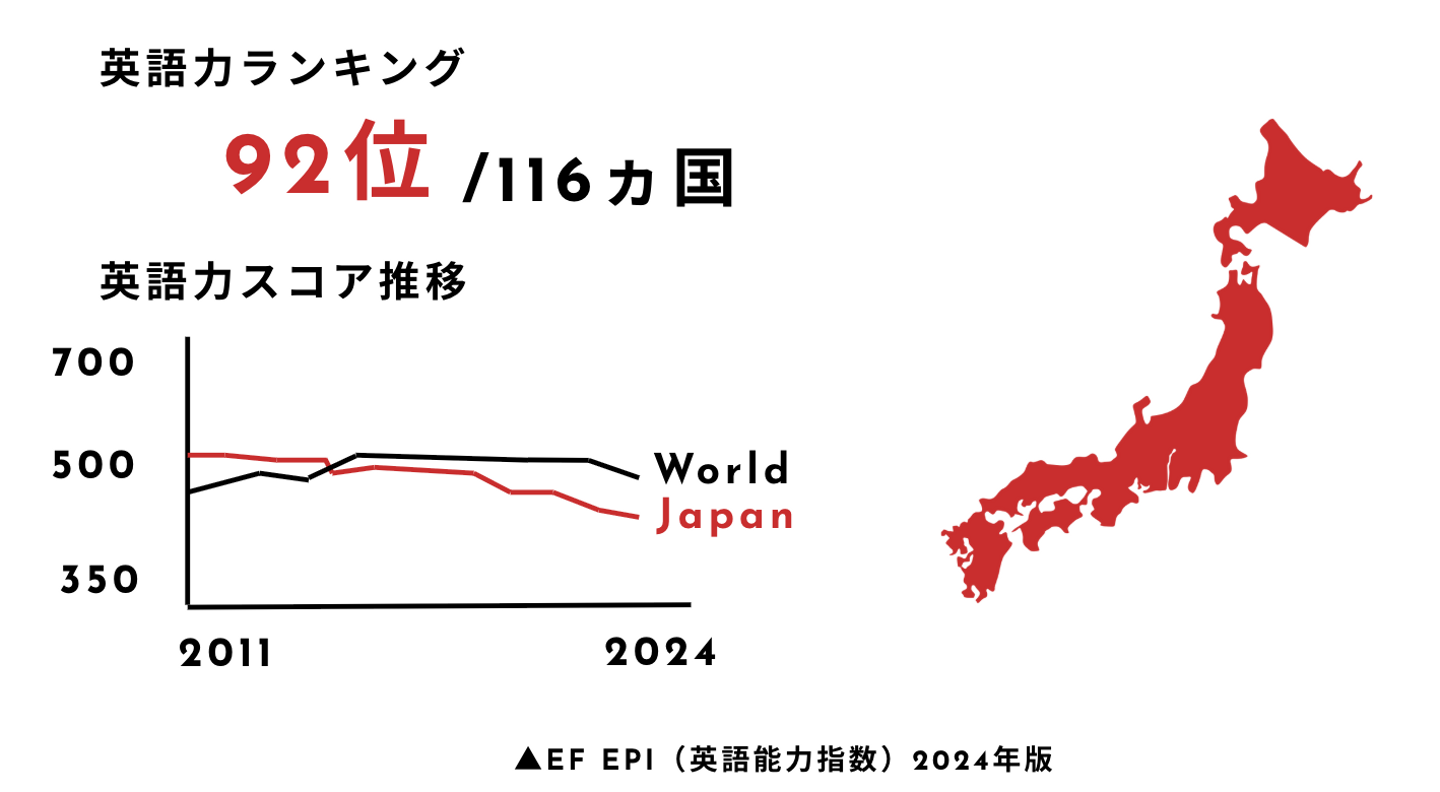 EF Education Firstが発表する「EF EPI(英語能力指数)2024年版」によると、日本は世界116国中、過去最低の92位に位置しており、平均スコアは454ポイントでした。これは、英語力が低い国・地域(62位〜92位)の中で最下位にあり、日本の英語力が国際的に低い水準にあることを示しています。