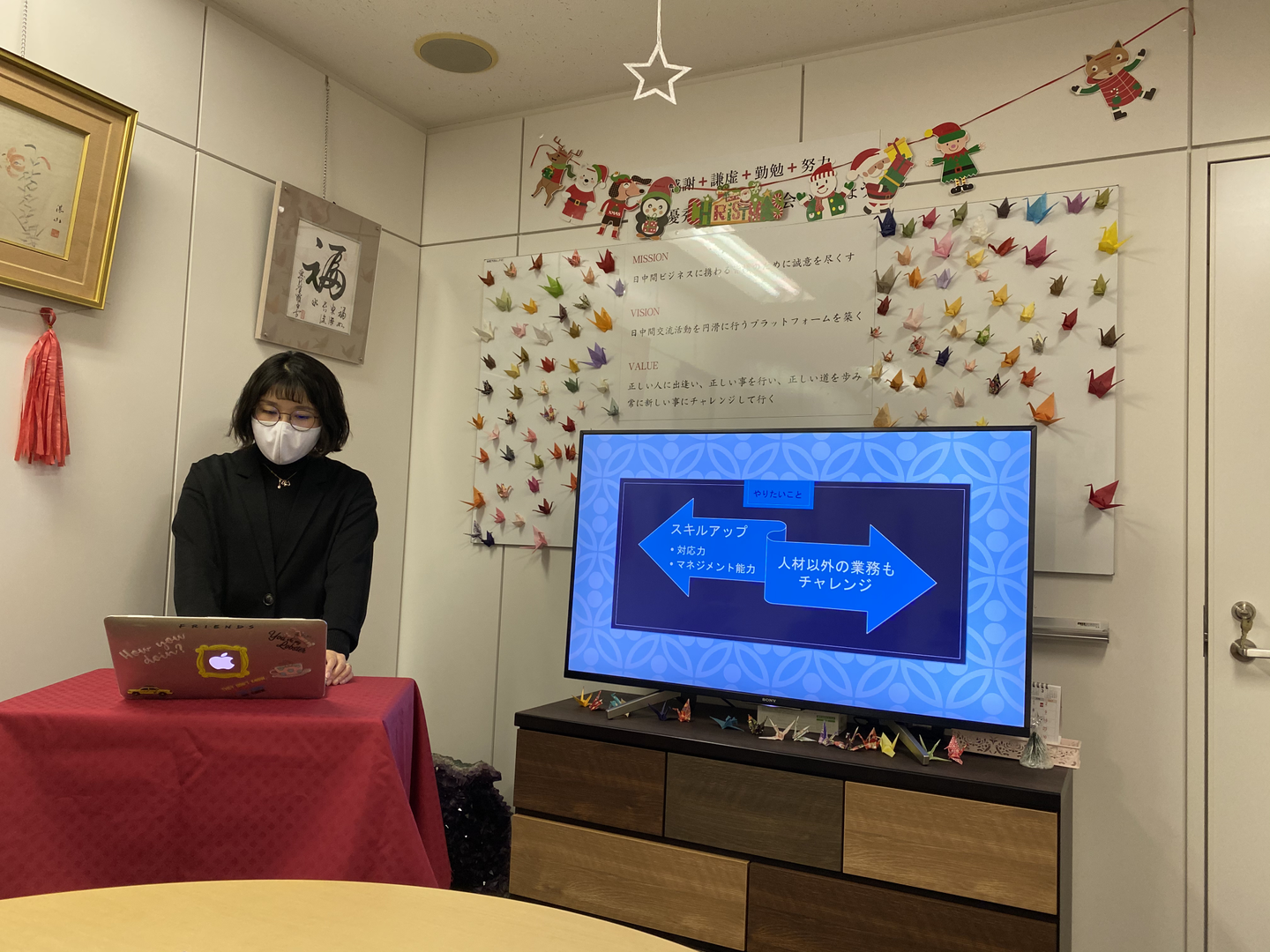 企業の魅力、組織・風土の魅力、仕事内容の魅力の3点についてお話しします。企業の魅力というのはビジョンが明確になっております。人材紹介の会社は何百社、恐らく何千社とあると思いますが、『日中間人材ビジネス』に特化した会社はTOHOKIだけだと思います。中国市場の成長と独自の戦略によりこれからもさらなる成長が期待できます。組織・風土の魅力については、会社はまだ少人数ですが、意見を率直に言い合える職場です。役職・部署に関係なく意見し合うこともできますし、上司との面談機会が多くあるので意見を伝えやすいです。また、誰か旅行に行ったらお土産を配ったり、社員たちのお祝い事、誕生日にはみんなでお祝いをしたりイベントごとも多いです。仕事内容の魅力は人材業界の仕事以外、入社してから、KOLたちと一緒に高級ブランドのライプ配信イベントに参加したり、クライアントと一緒に研修したり、いろいろな仕事に携われるというのは非常に充実しています。