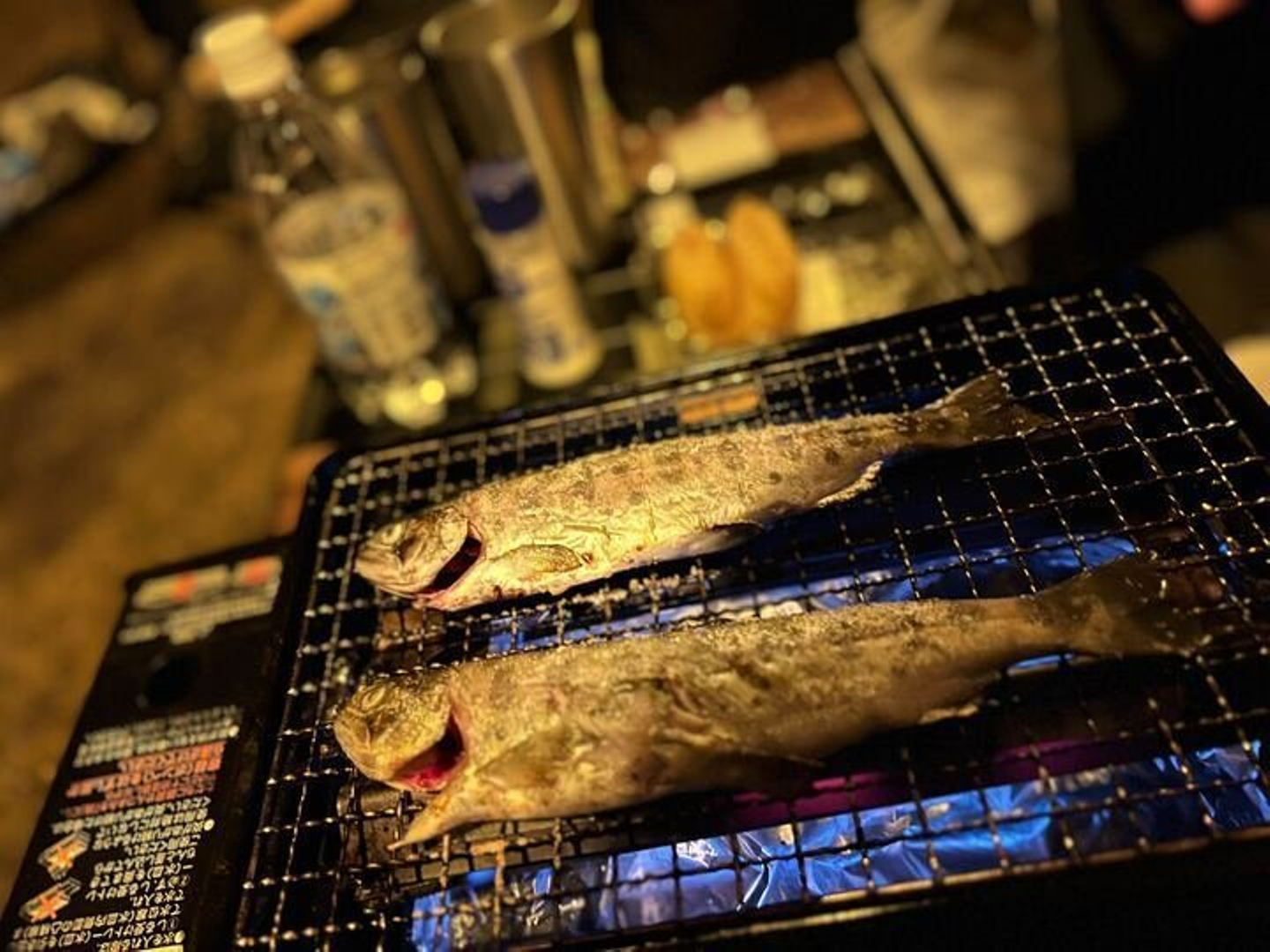 サウナのあとは、炭火でヤマメをじっくり焼いて、静かなキャンプ飯。