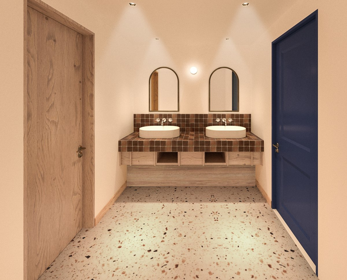 パースの中に描かれた、グレージュの木目と優雅な曲線。