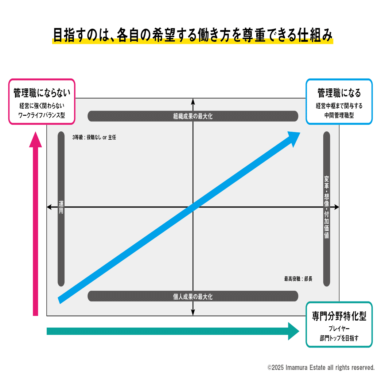 詳細は省きますが、例えばプレイヤーとして現場で力を発揮し続けたい人がいれば、無理に管理職に登用するのではなく、その希望に沿った形でキャリアを描けるように職務を割り振るといった形です。