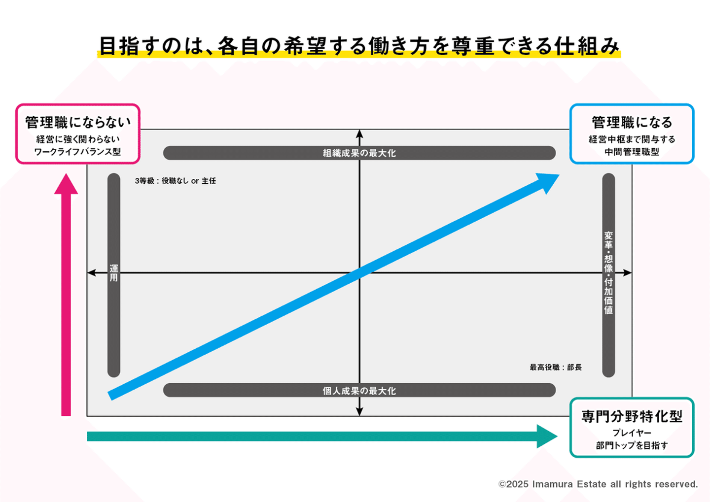 「キャリアアップ」だけでなく「自分らしい働き方」を軸にしているのが特徴です。単に昇進だけを重視するのではなく、個々の希望する働き方を尊重し、自分自身の未来を自ら描ける仕組みを目指しました。