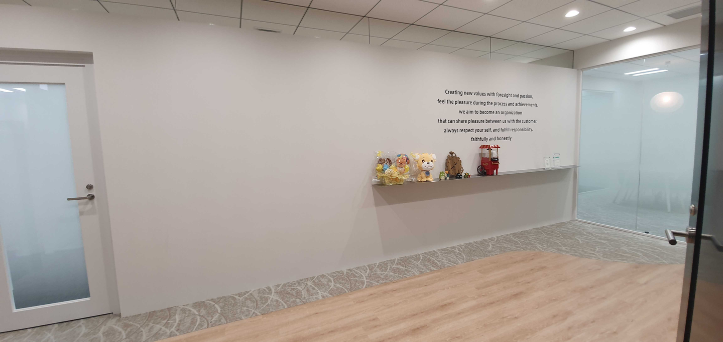 壁には弊社の企業理念が英語でプリントされています!