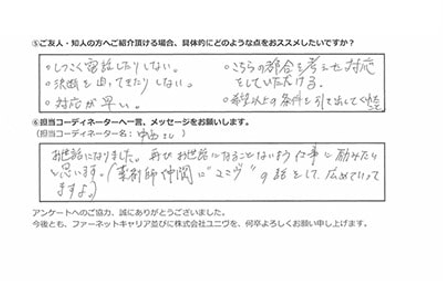 ”お世話になりました。再びお世話になることないよう仕事に励みたいと思います。(薬剤師仲間に“ユニヴ”の話をして、広めていってますよ。)”
