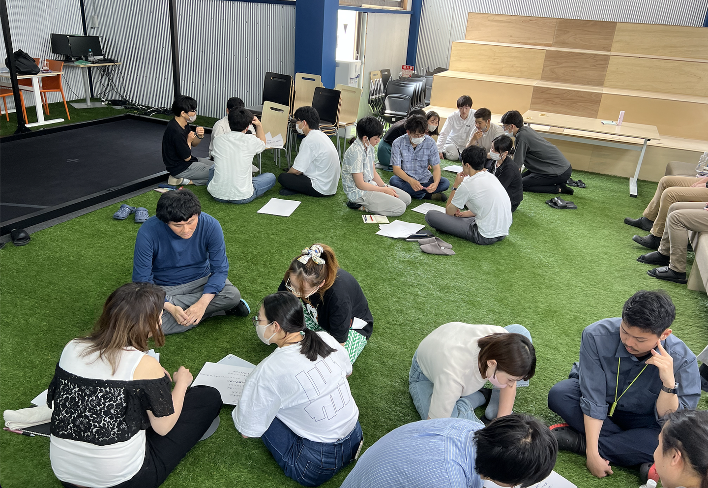 その後に、今回メインである勉強会を講師を迎え、開催致しました!!本社は昨年5月に移転しておりますが、3階には芝生がひいてあり、そこでみんなで座りながら、勉強会がスタートしました。