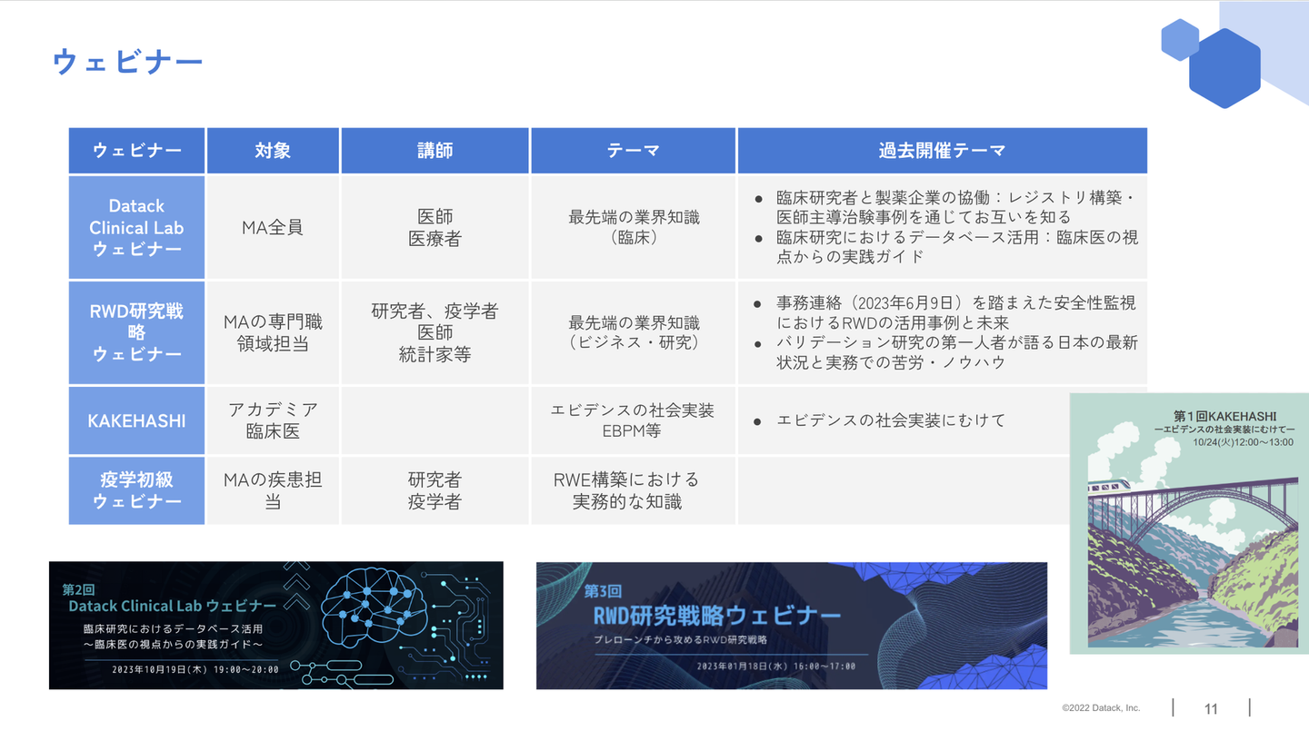 初期から顧客である製薬企業の研究担当者/RWD(リアルワールドデータ)関連部署を対象としたウェビナー活動を行っていますが、業界における共通課題や最先端事例を取り扱うため、とても好評です。