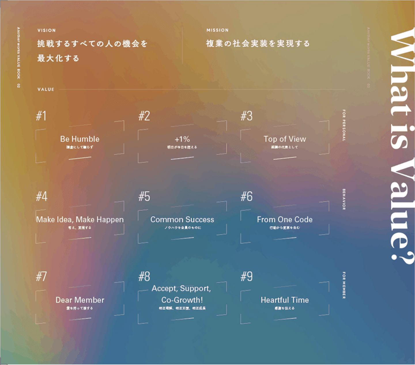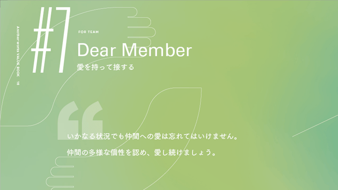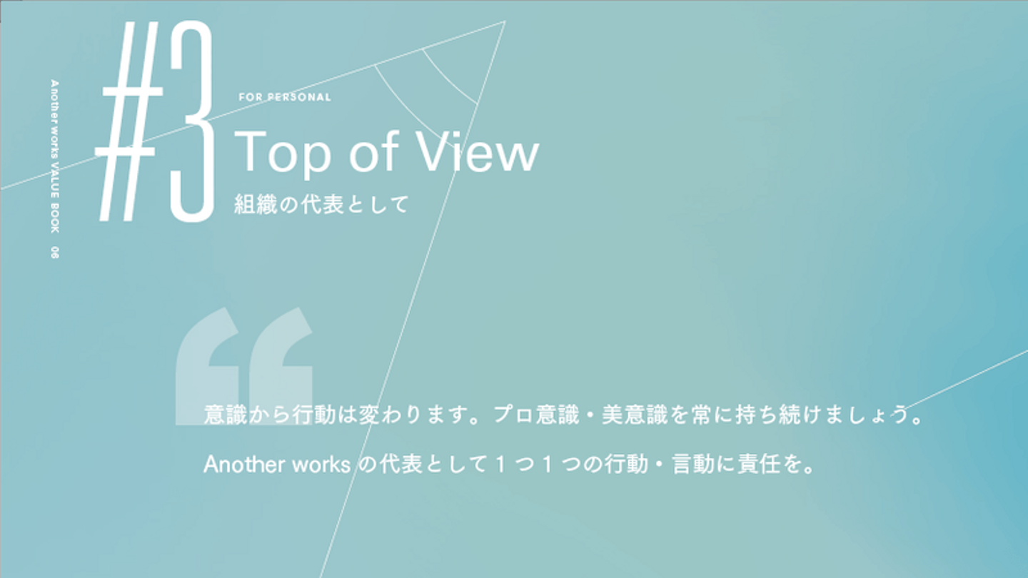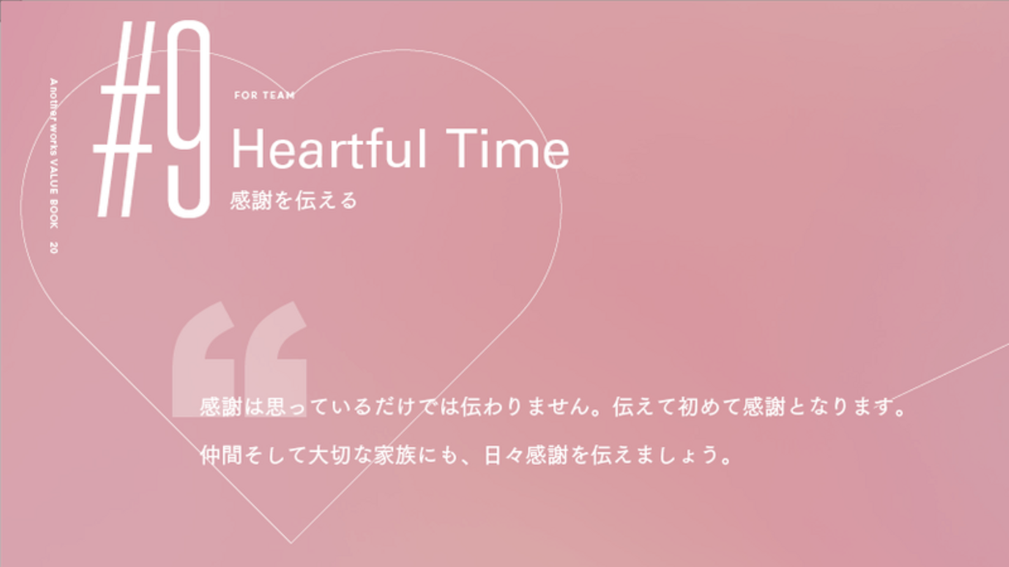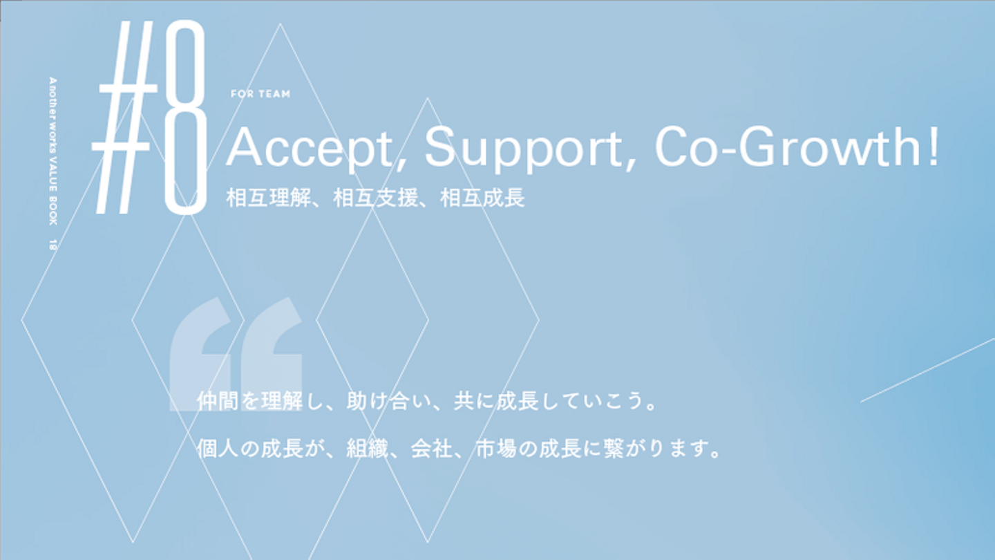 中でも、9つのValueは、Another works の憲法としています。創業期から大切にしており、Vision「挑戦する全ての人の機会を最大化する」を達成するためには欠かせない行動指針です。