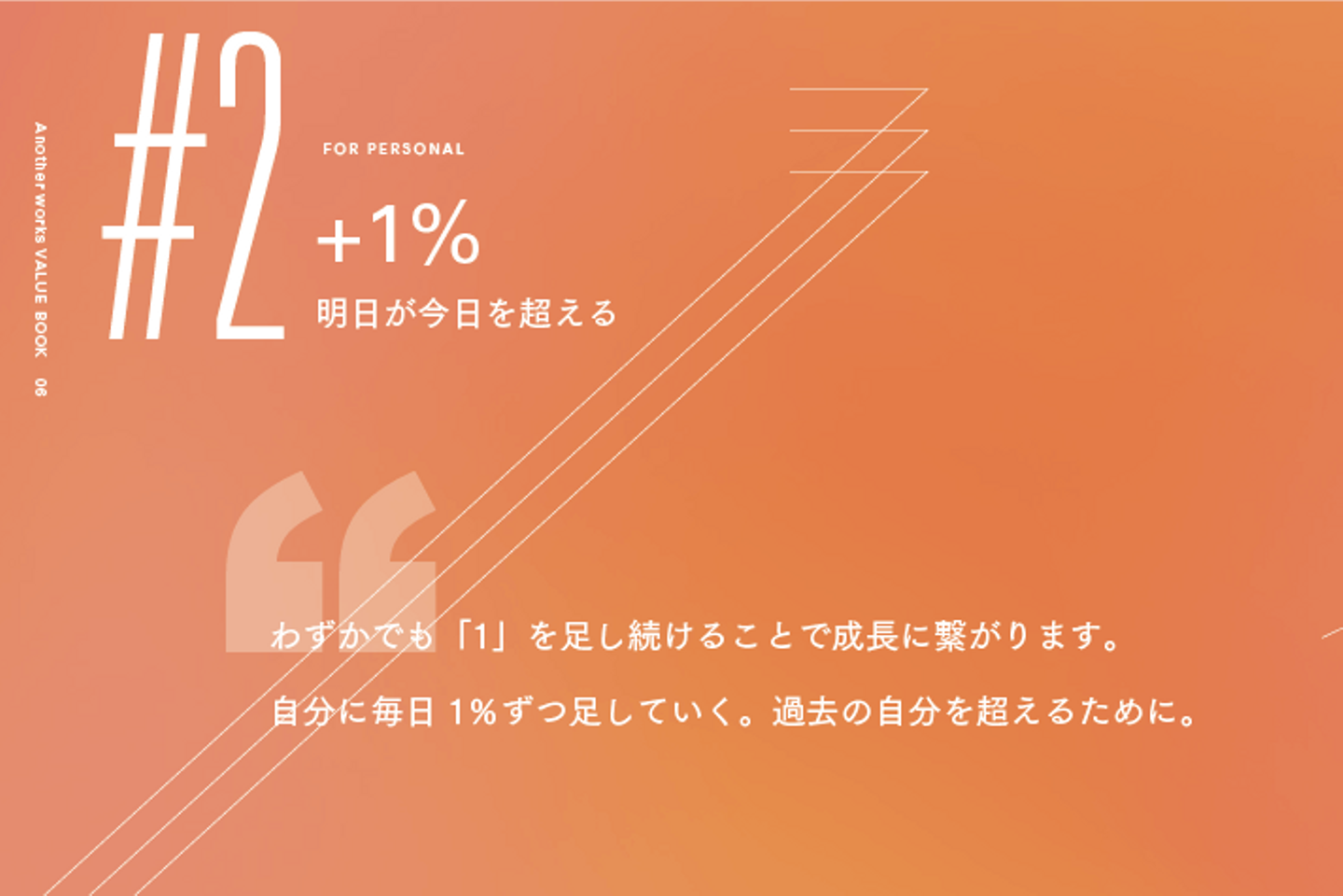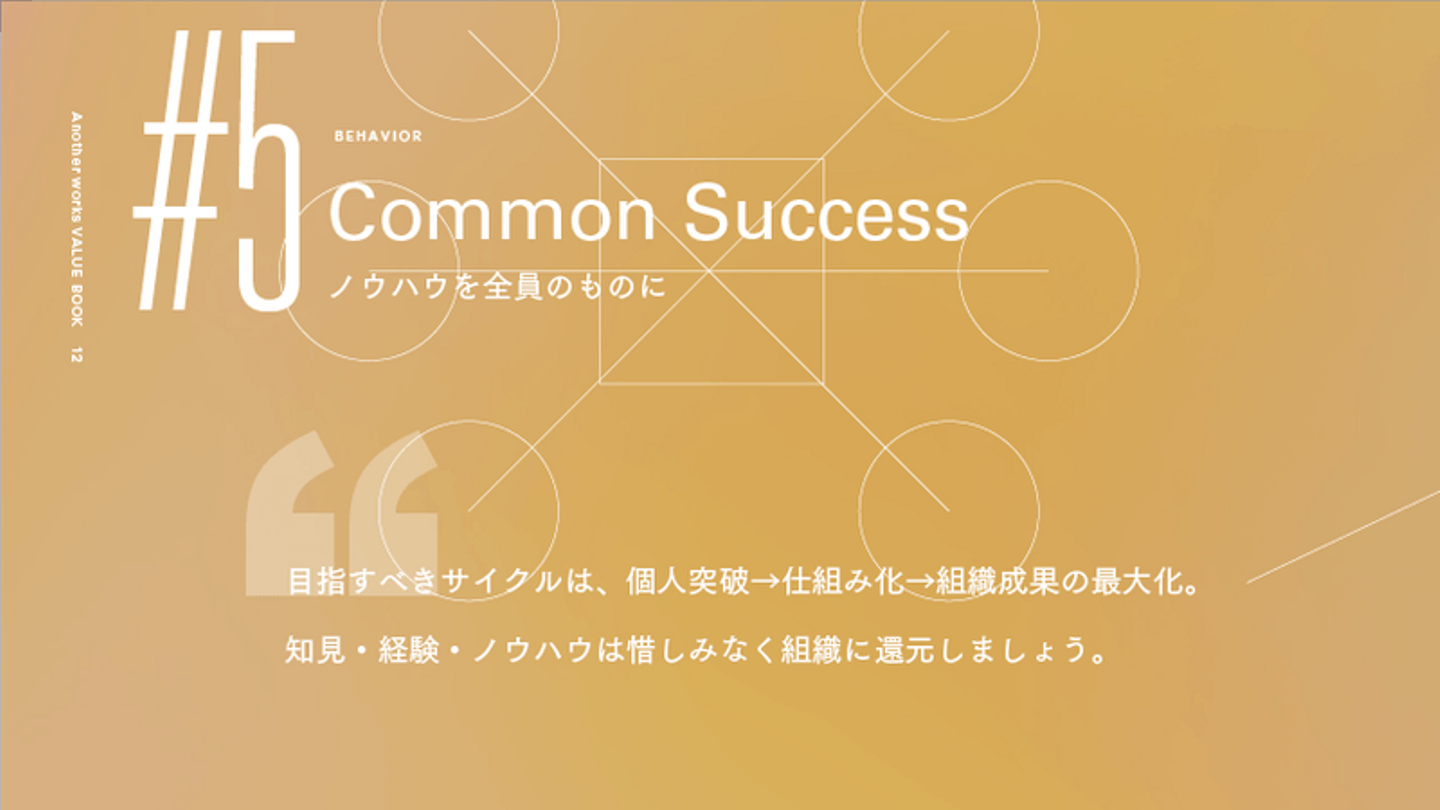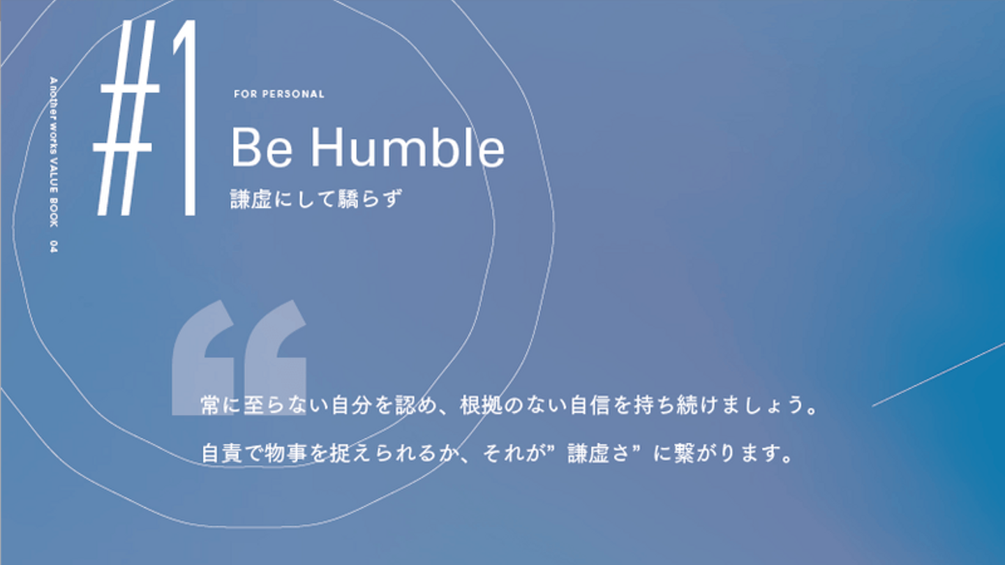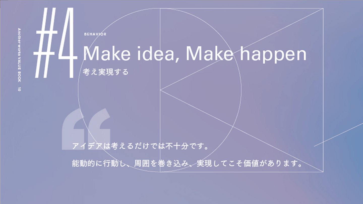 中でも、9つのValueは、Another works の憲法としています。創業期から大切にしており、Vision「挑戦する全ての人の機会を最大化する」を達成するためには欠かせない行動指針です。