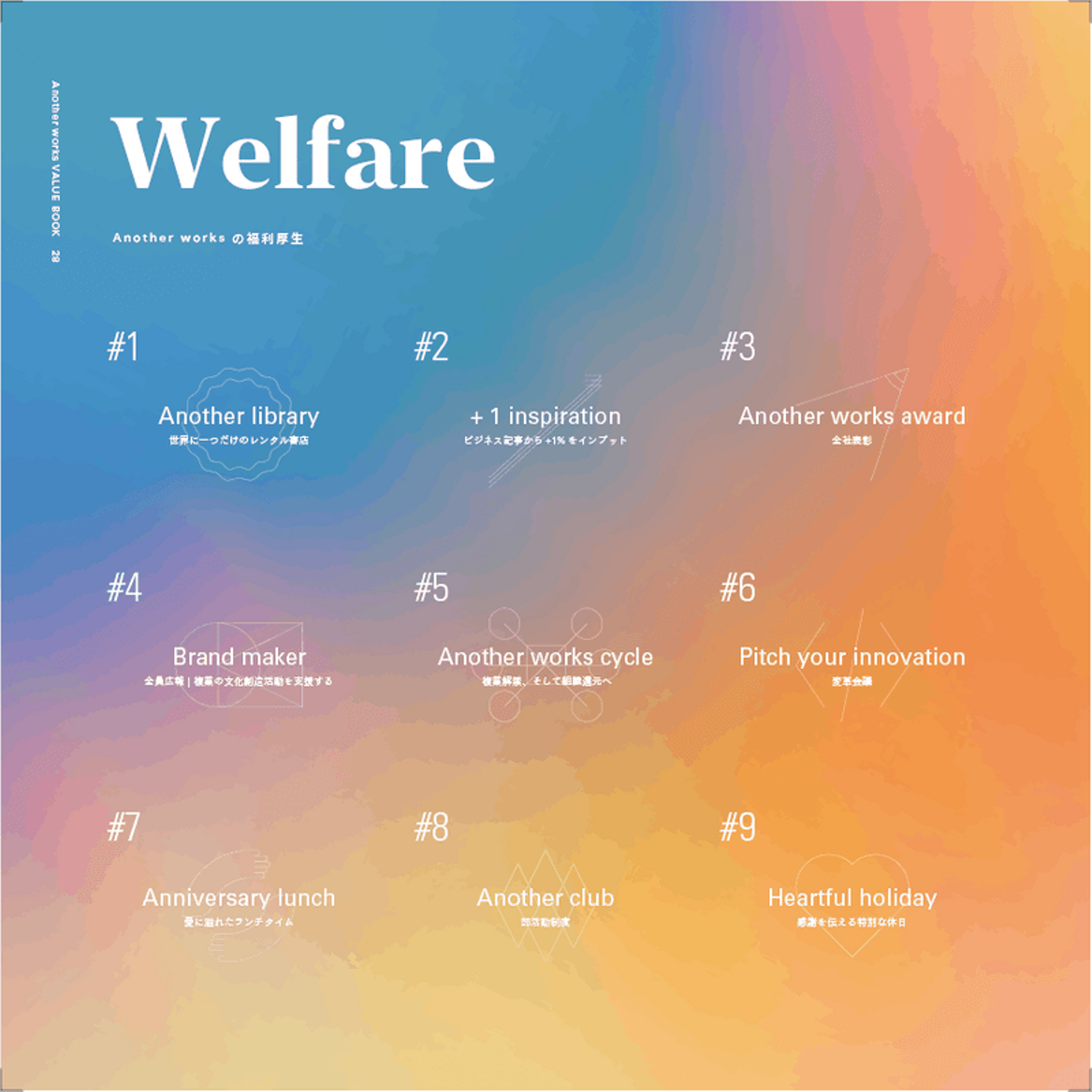 福利厚生は、主な目的にもあるように働きやすい環境にすることで、従業員の能力発揮とその成長を支援するために設置されます。弊社でもValueという行動指針の基、さらなる挑戦を支援するため、9つのValueに沿った9つの福利厚生を創ろうと決意しました。