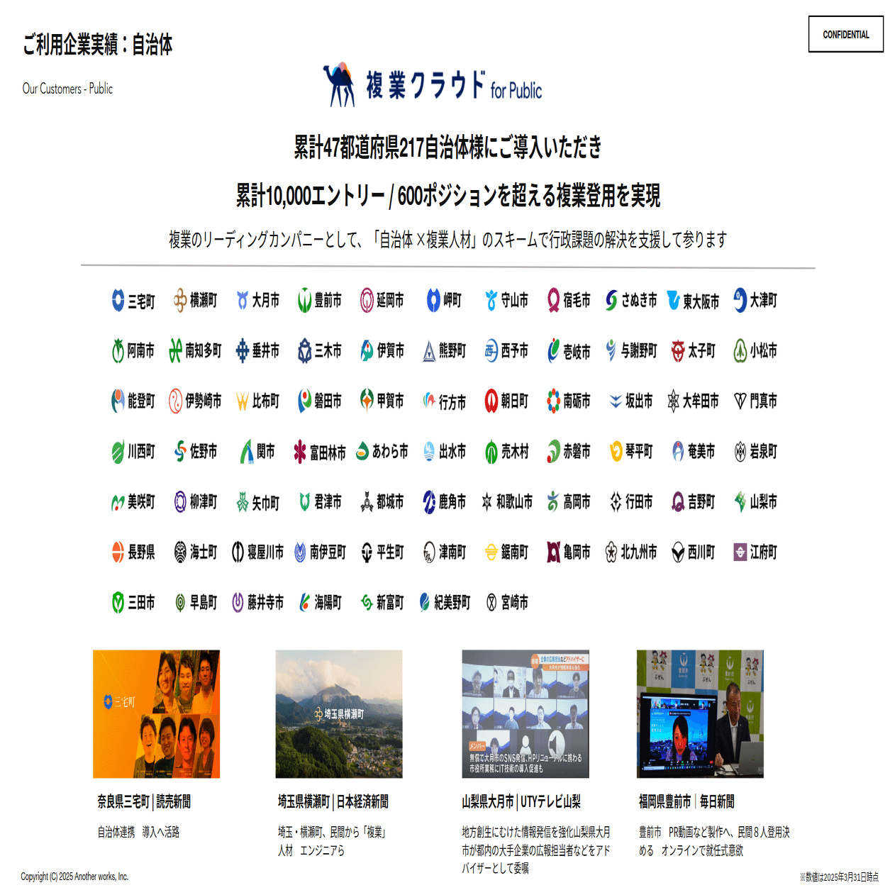株式会社Another worksは、複業したい人と企業や自治体をつなぐ日本最大級の複業マッチングプラットフォーム「複業クラウド」 を運営している会社です。企業は月額定額で仲間にしたい複業パーソンを何名でも採用可能。現在は、2,000社・47都道府県217自治体・約10万名が利用しています。