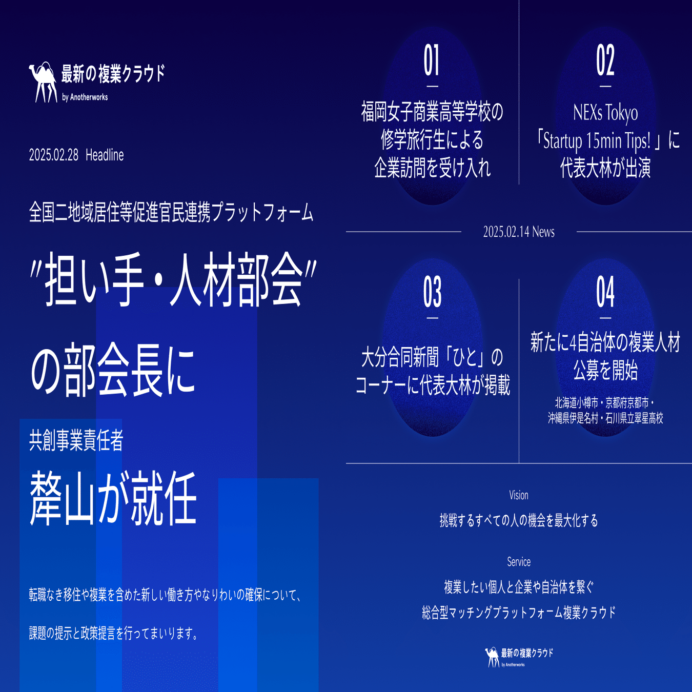 「全国二地域居住等促進官民連携プラットフォーム」に新設された”担い手・人材部会”の部会長にAnother worksが就任株式会社Another worksのプレスリリース(2025年2月21日 09時00分)